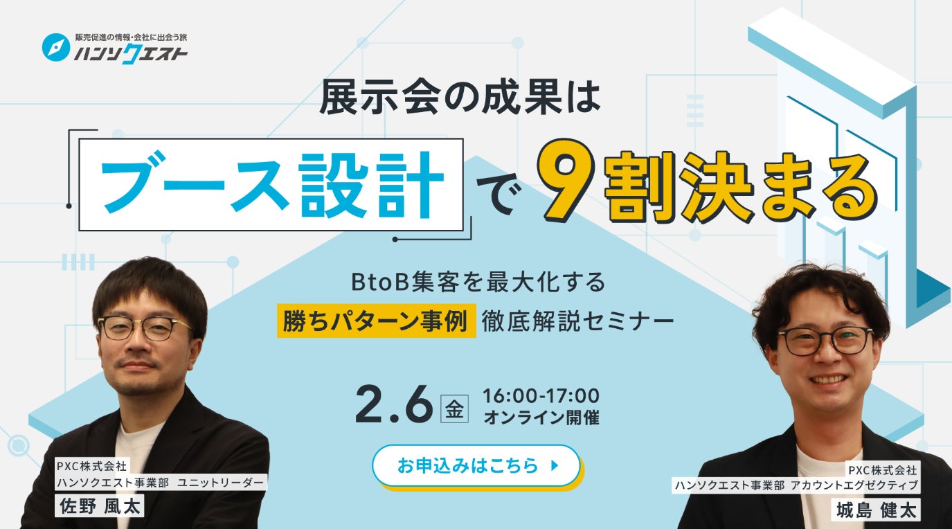 Corporate Promotion DX CompanyのPXC株式会社(https://pxc.co.jp )が運営する、国内唯一*1の販促特化型ビジネスマッチングサイト「ハンソクエスト」(https://hansokuest.jp/)は、2026年2月6日(金)、展示会出展における集客課題を解決するためのオンラインセミナー「展示会の成果は『ブース設計』で9割決まる ─ BtoB集客を最大化する<勝ちパターン事例>徹底解説セミナー」を開催いたします。