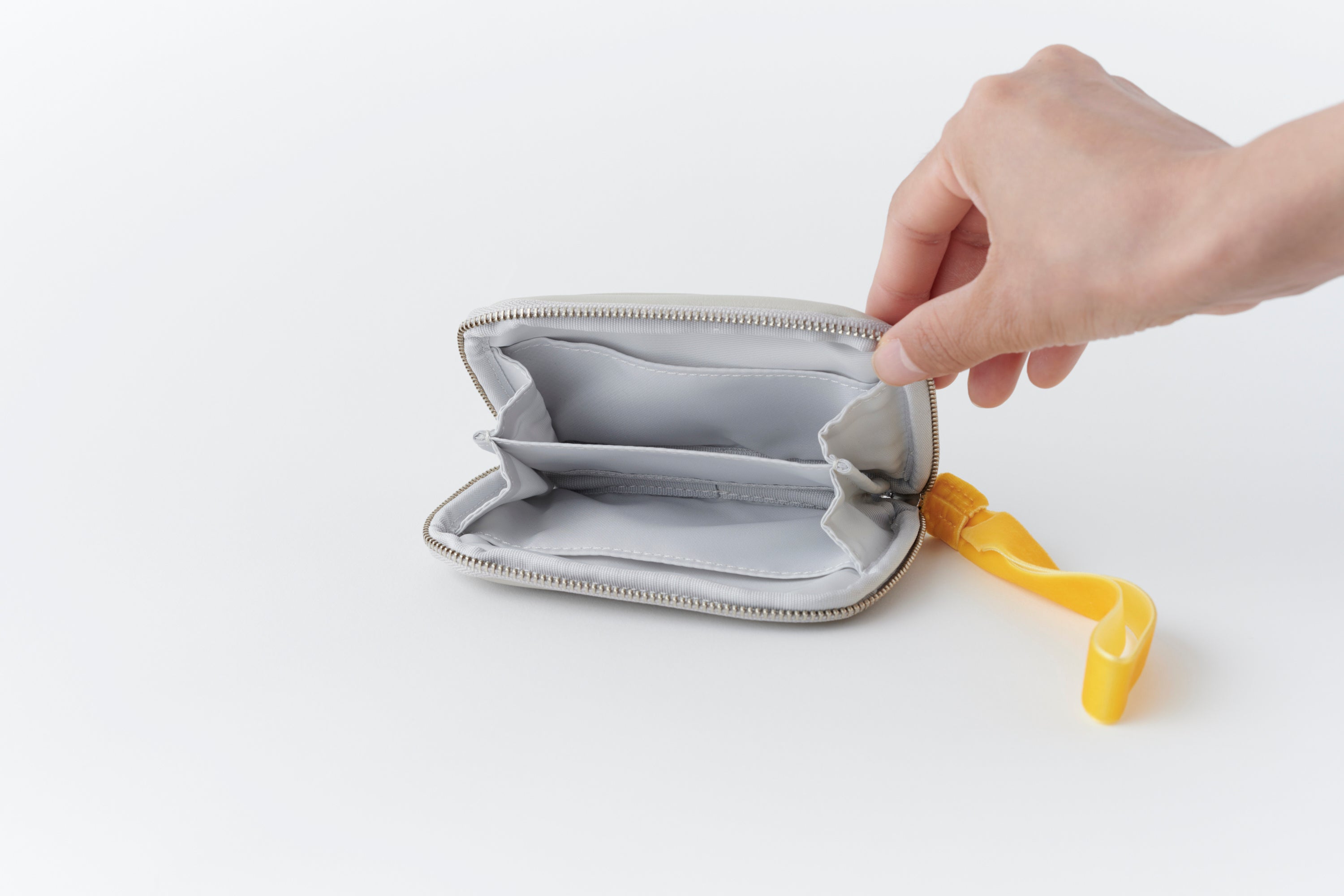 カードや名刺、鍵やイヤホンなど身の回りの小さなものをひとまとめにできるミニポーチです。カードや名刺がぴったり入るサイズで、じゃばら状に開くかたちが特徴です。こまごまとしたものを分類しやすいよう、内部は4つのゾーンに分かれています。
