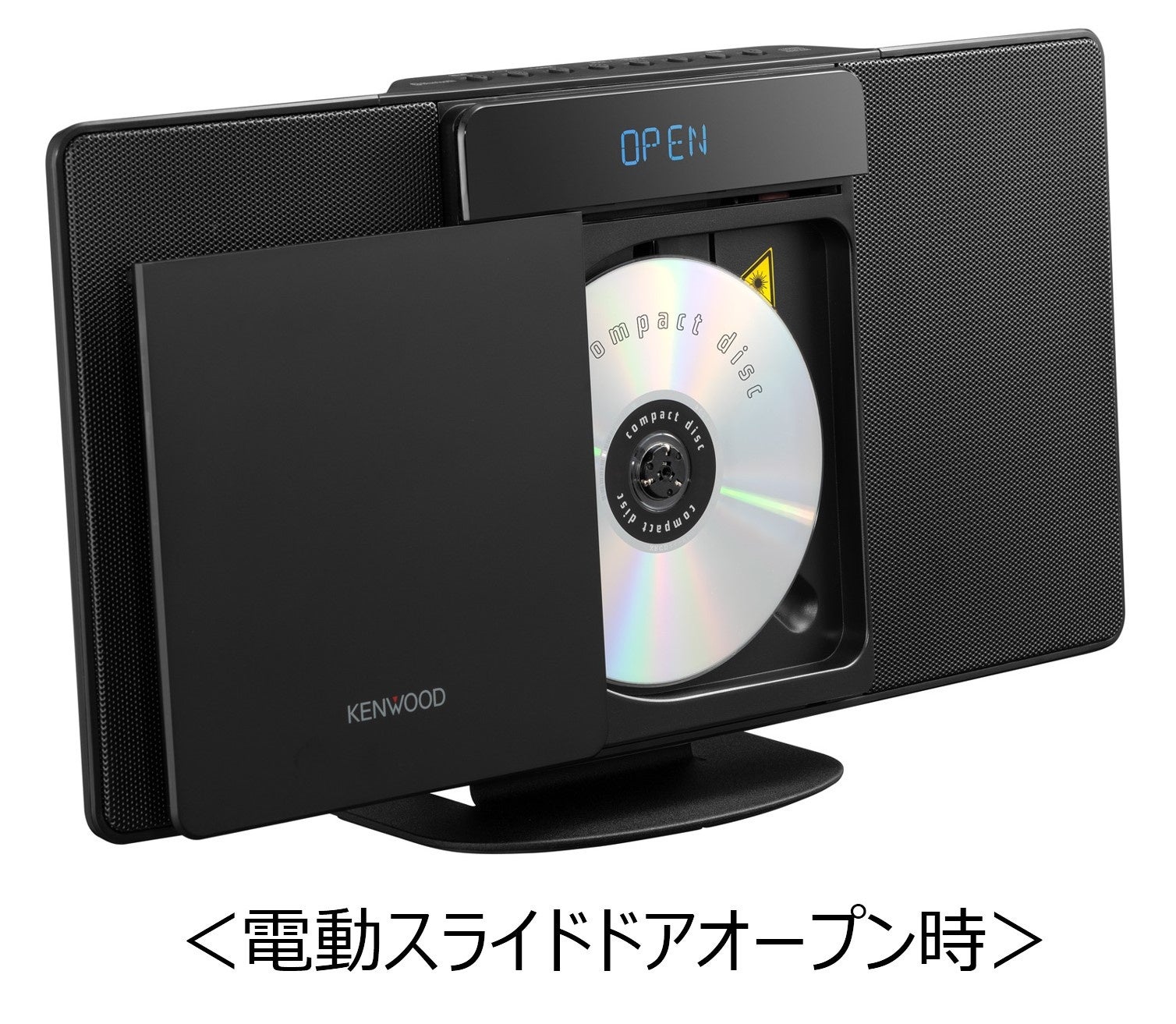 本機は、幅37.5cm・奥行き9.8㎝で電動スライドドア(CD部)とスタンドを装備したコンパクトな縦型スリムデザインを採用し、スペースを取らず、さまざまな場所に設置できます。また、CDやワイドFM、USB、外部入力、Bluetooth🄬の搭載により幅広い音楽ソースに対応。さらに、音楽再生時のダイレクト選曲に便利な10キー付きで、語学学習などで聴きたいフレーズをすばやく探せる前後5秒スキップボタンや、聞き取り再生に便利なリピート再生など多彩な再生機能に対応するリモコンを付属し、使いやすさにも配慮しました。