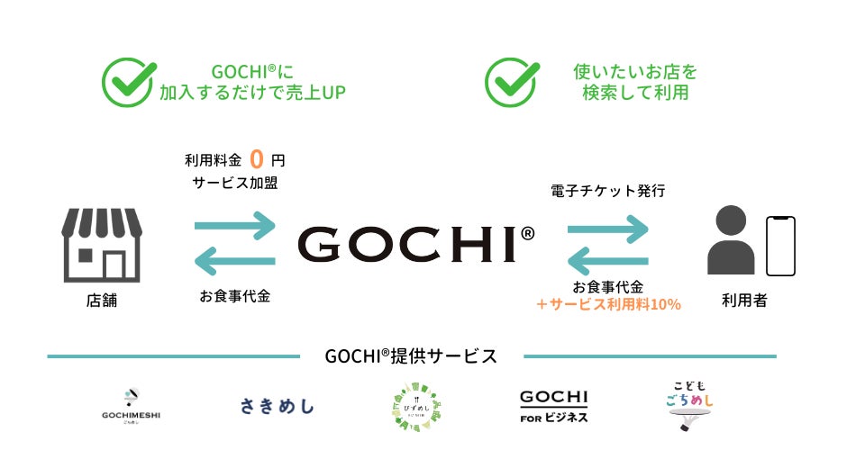 当社は、GOCHIプラットフォーム(通称「GOCHI®」)を通じて、オンラインで飲食店のメニューを贈れるギフトサービス「ごちめし」、まちの飲食店が社食になる福利厚生サービス「びずめし」、行きつけのお店を、先払いで応援する「さきめし」、まちの飲食店をこども食堂として利用する「こどもごちめし」等、さまざまなサービスを展開しています。