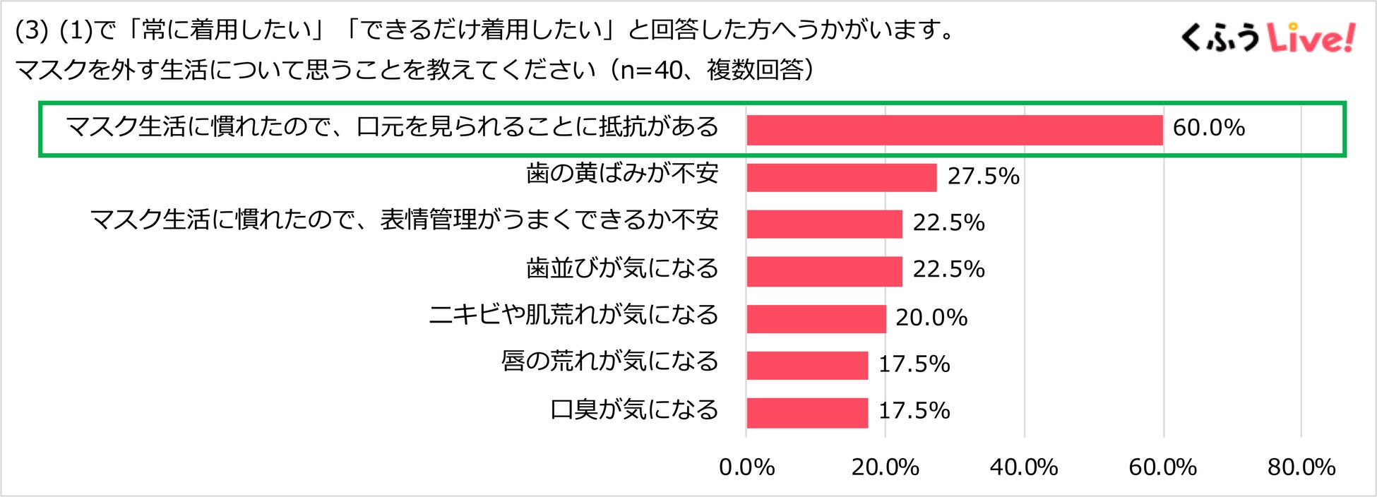 3月13日以降は「常に着用したい/できるだけ着用したい」と回答した「着マスク派」の方々を対象に、マスクを外す生活について思うことをたずねたところ、「マスク生活に慣れたので、口元を見られることに抵抗がある」との回答が60.0%となりました。自由回答の中には「顔を見られる機会が増えるので肌の手入れや歯のケアが気になる」との声もあがりました。