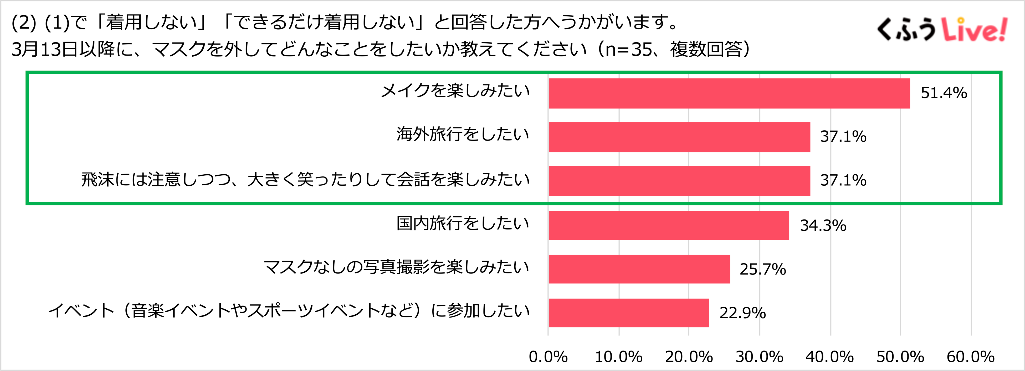 3月13日以降は「着用しない/できるだけ着用しない」と回答した「脱マスク派」の方々を対象に、今後やりたいことについてたずねたところ、「メイクを楽しみたい」との回答が51.4%で最多となり、次いで「海外旅行をしたい」「飛沫には注意しつつ、大きく笑ったりして会話を楽しみたい」との回答がいずれも37.1%となりました。3月13日以降、化粧品や旅行のニーズが高まりそうです。