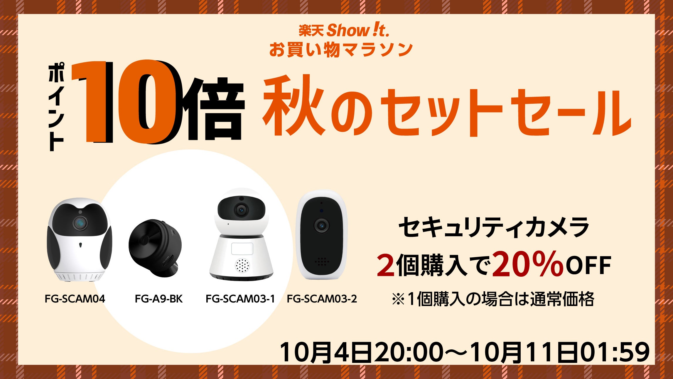 楽天市場「Show !t」は、10月4日20時から同一商品のセキュリティカメラを2個購入で20%OFFセールを開始、さらに、全商品ポイント最大10倍プレゼントの楽天お買い物マラソンに参加。