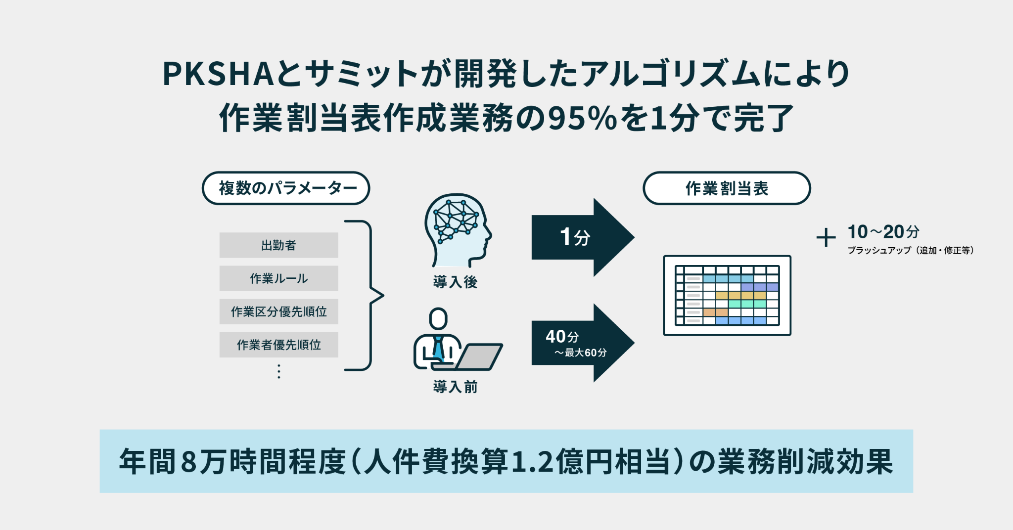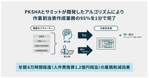 株式会社PKSHA Technology(代表取締役:上野山 勝也、以下PKSHA)は、サミット株式会社(本部:東京都杉並区、代表取締役社長:服部 哲也、以下サミット)と、アルゴリズムによる作業割当表作成支援システムを共同開発し、2023年4月よりサミット全122店舗に展開することをお知らせします。