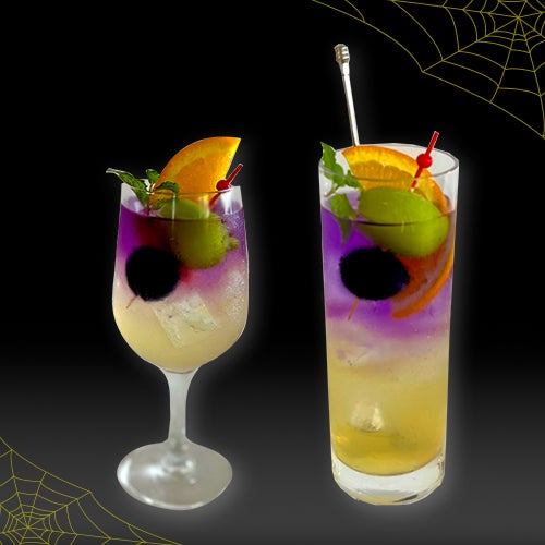 大人のハロウィンをテーマに、魔法の夜を感じさせる魅惑的な紫のグラデーションが映える、彩華やかなカクテル。