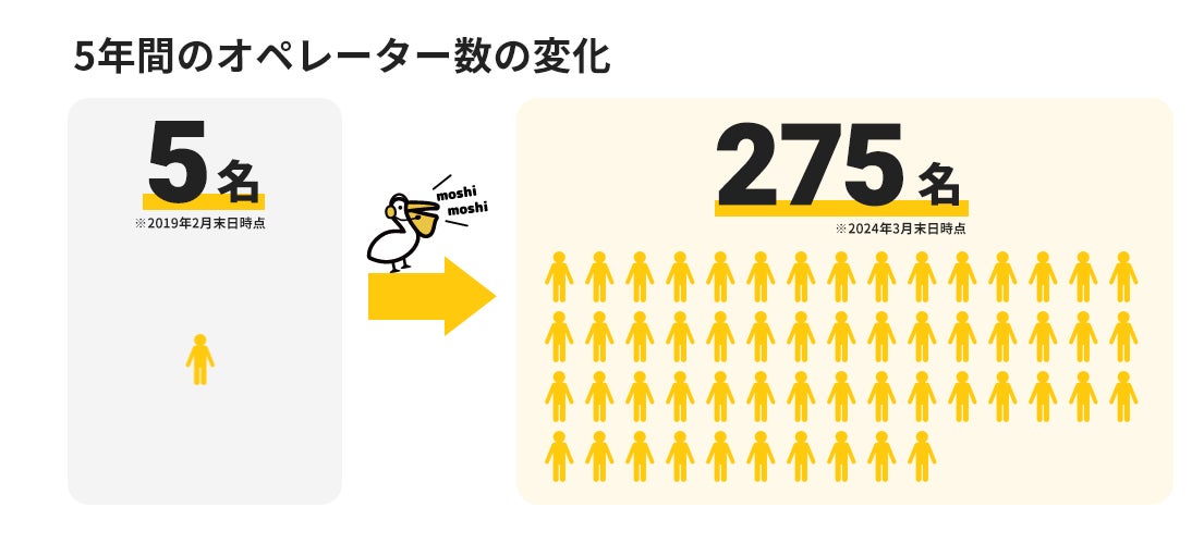 「fondesk」は全国各地のオペレーターの活躍により、受電率が高いことも特徴です。サービス開始時は5名だったオペレーターも現在は275名まで増え、現在は55倍以上での運用体制となっています。