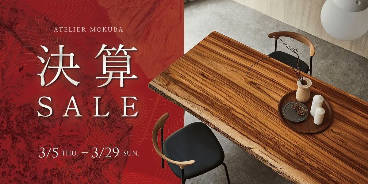 アトリエ木馬全店、および公式オンラインストアでは決算セールを実施しており、一枚板テーブルや関連家具を特別価格で提供しています。今回公開したコーディネート事例ページで紹介しているアイテムのように、一枚板を暮らしに取り入れる機会としてぜひご活用ください。
