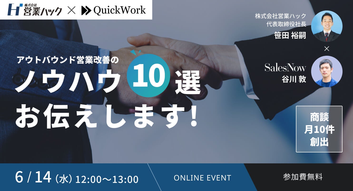 そこで今回のテーマは「明日から使えるアウトバウンド営業のノウハウ10選」。新規開拓営業・アウトバウンド営業を効果的に行うためのノウハウについてB2B顧客開拓プラットフォーム「SalesNow」で働き方の変革を支援する営業株式会社QuickWork様をお招きし、セミナーを開催します!