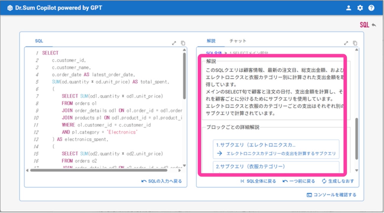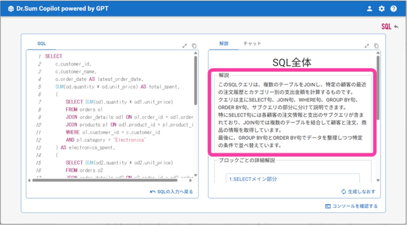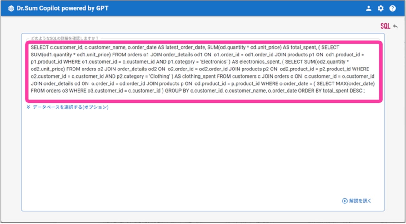 本機能は、データベースの引き継ぎ直後でスキル向上を目指す運用者やSQLの開発に膨大な時間を要している担当者を支援するために開発されました。これにより、「Dr.Sum Copilot」では、自然言語からのSQL生成を行うことに加え、既存のSQLを自動で解析・解説が可能となり業務効率化と属人化の解消に貢献します。