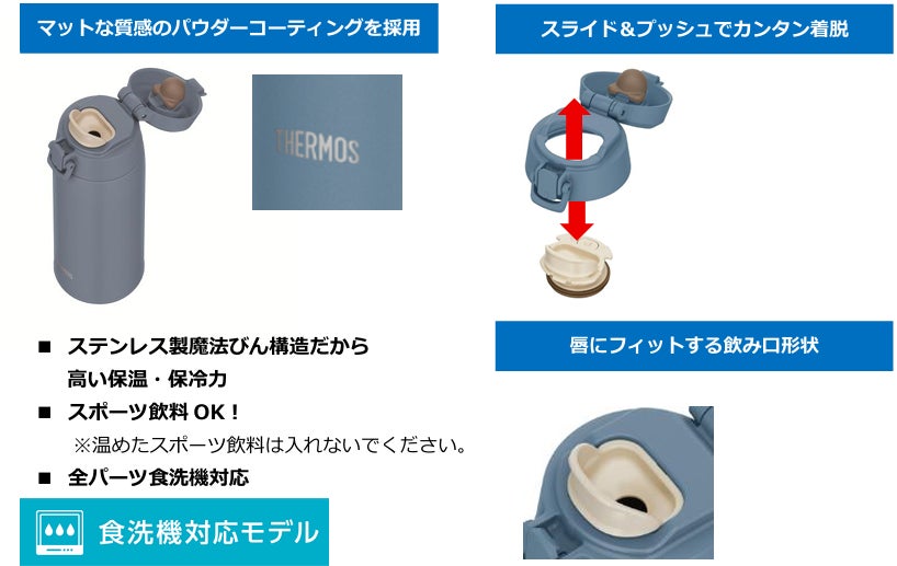 本製品は、表面にマットな質感のパウダーコーティングを施したケータイマグです。片手で操作しやすい“ワンタッチ・オープン”構造と、唇にフィットして飲みやすい飲み口形状を採用しました。さらに全パーツ食洗機対応で、お手入れもカンタンです。ステンレス製魔法びん構造による高い保温・保冷力が飲み頃温度をキープします。