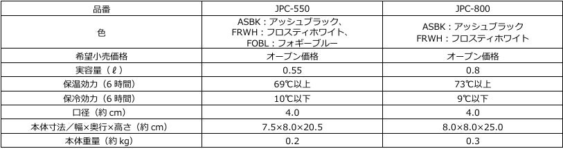 『真空断熱ケータイマグ(JPC-550/800)』 仕様一覧