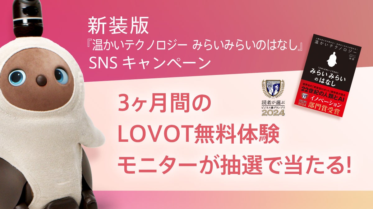 新装版の出版を記念し、XまたはInstagramでハッシュタグ「#みらいみらいのはなし」を付け、本書の中の好きな一節やフレーズまたは感想を添えて投稿すると、『LOVOT』の3ヶ月無料体験モニターが抽選で2名様に当たる「新装版『温かいテクノロジー みらいみらいのはなし』 SNSキャンペーン」を開催いたします。