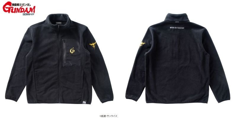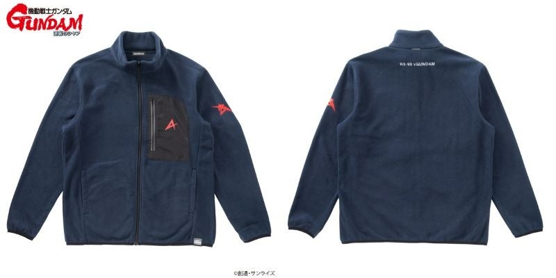 「フリースジャケット」は、「νガンダムモデル」、「サザビーモデル」の2種展開。ベーシックなフリースジャケットに、それぞれのマークや型式が入るデザインです。左胸はプリント、左袖と背面首元は刺しゅうで表現しました。