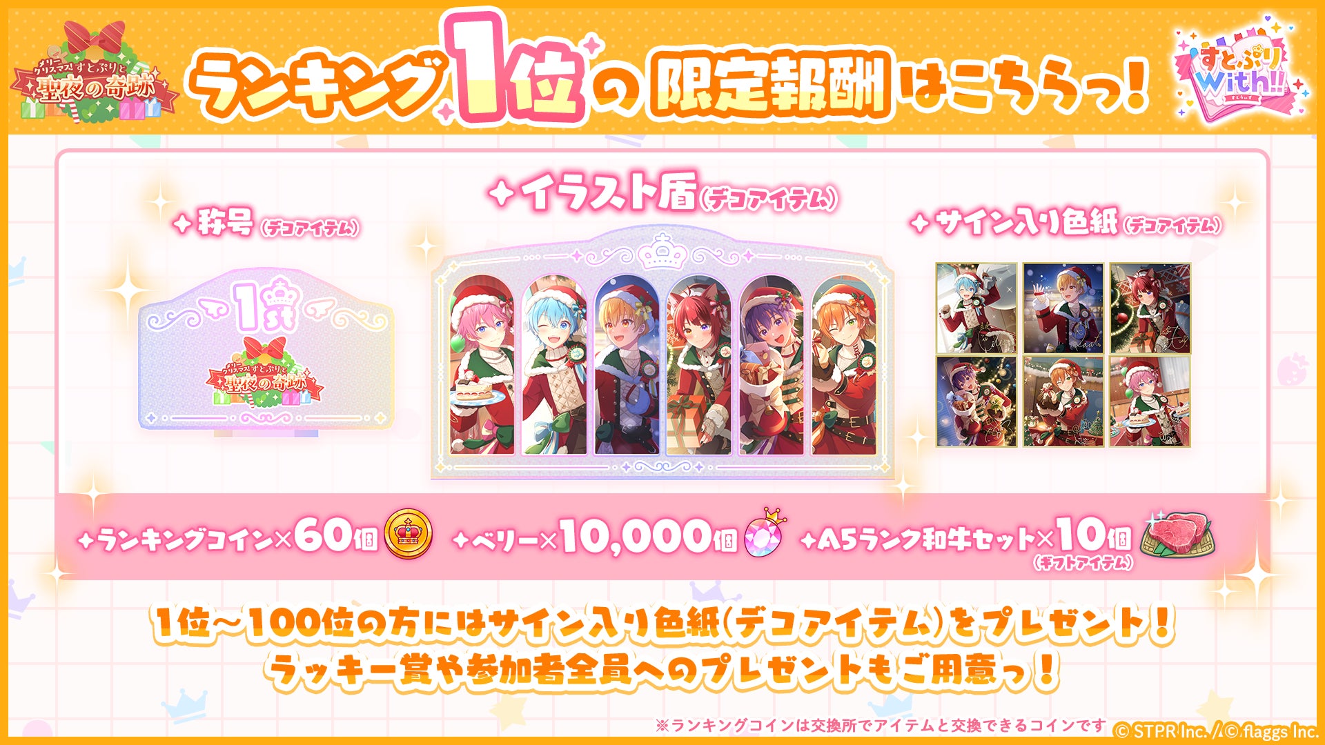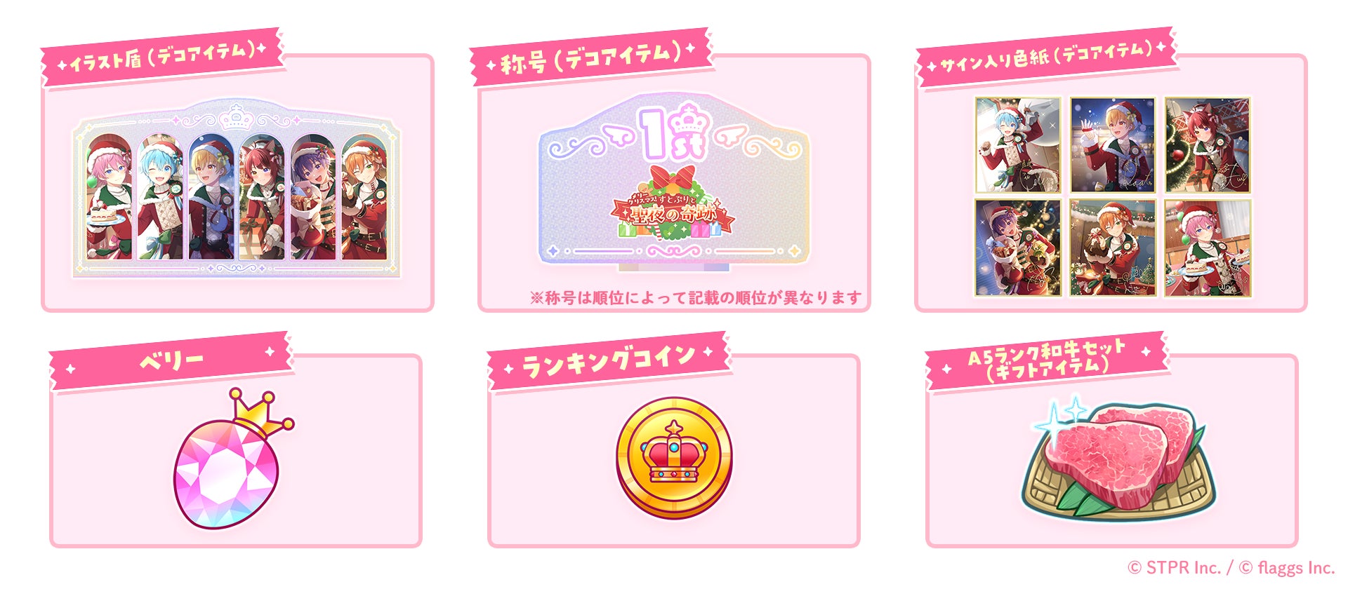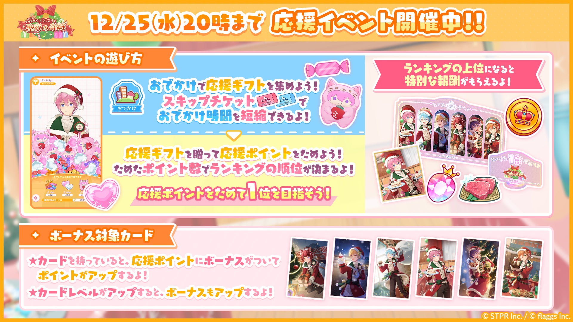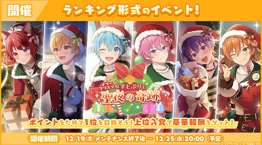 株式会社STPR(本社:東京都渋谷区、代表取締役:柏原 真人、以下STPR)と株式会社flaggs(フラッグス)(本社:東京都品川区、代表取締役CEO:吉江 直人)は、本日12月19日(木)に2.5次元アイドルグループ「すとぷり」の公式ゲームアプリ「すとぷりWith!!(通称:すとうぃず)」のゲーム内イベント「メリークリスマス!すとぷりと聖夜の奇跡 応援イベント」の開催についてお知らせいたします。