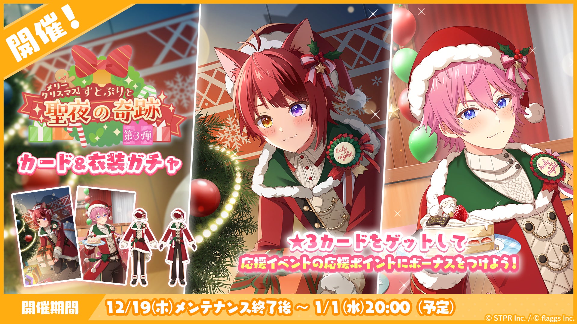 本日12月19日(木)より、新たな★3カードがピックアップ登場する「メリークリスマス!すとぷりと聖夜の奇跡 第3弾 カード&衣装ガチャ」が開催中です。