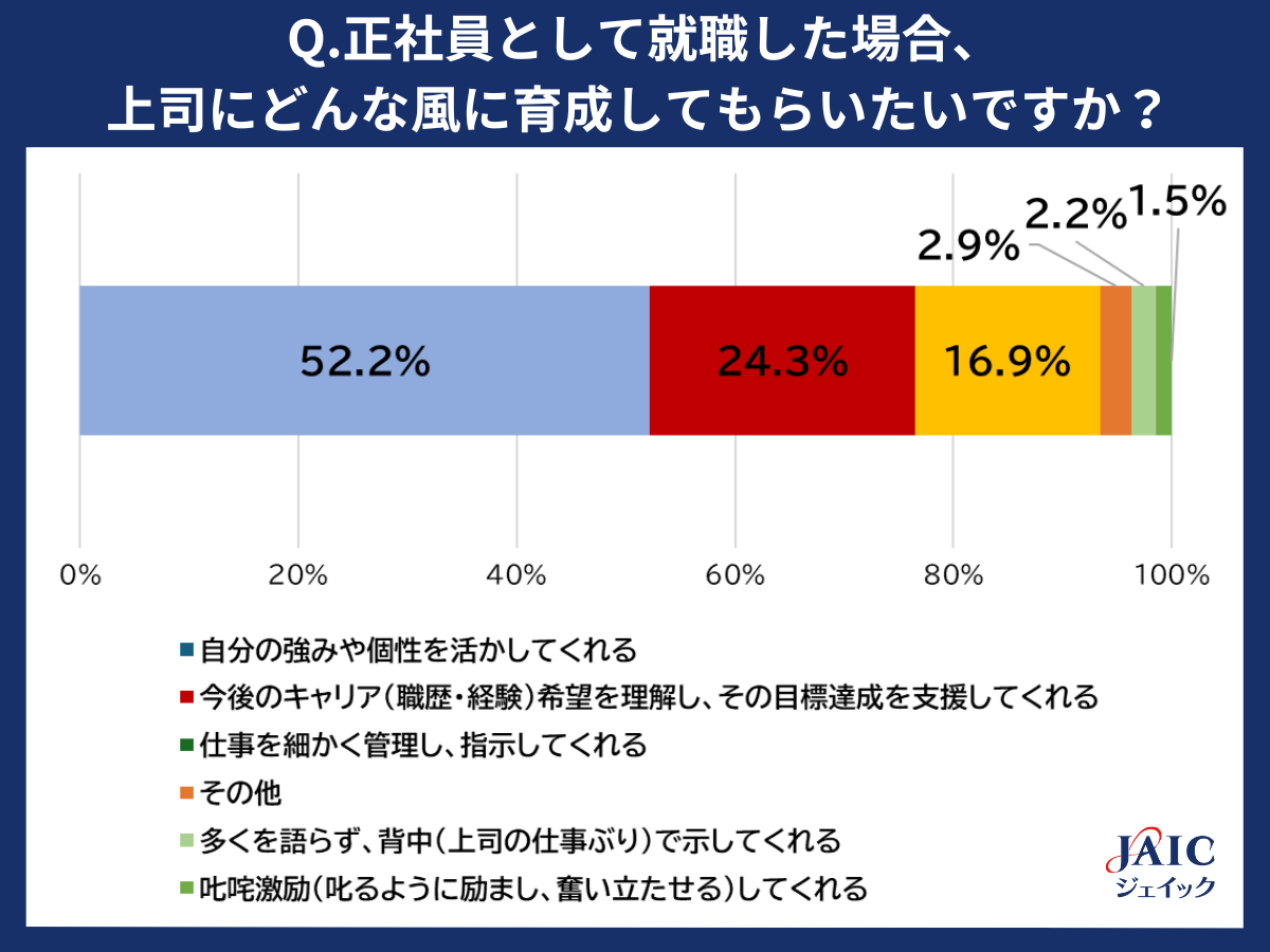 「正社員として就職した場合、上司にどんな風に育成してもらいたいですか?最も当てはまるものを1つ選択してください」と質問したところ、「自分の強みや個性を活かしてくれる」が52.2%、「今後のキャリア(職歴・経験)希望を理解し、その目標達成を支援してくれる」が24.3%、「仕事を細かく管理し、指示してくれる」が16.9%、「その他」が2.9%、「多くを語らず、背中(上司の仕事ぶり)で示してくれる」が2.2%、「𠮟咤激励(叱るように励まし、奮い立たせる)してくれる」が1.5%となりました。