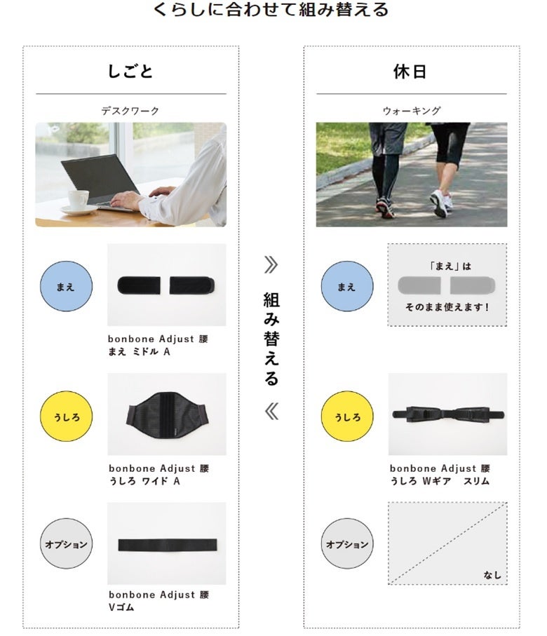 bonbone Adjust腰は、腰の状態や体型の変化、ライフスタイルなどに合わせてパーツを組み替え、使う人に寄り添うコルセットです。「まえ」と「うしろ」と「オプション」の3つのパーツに分かれており、様々な組み換えが可能です。