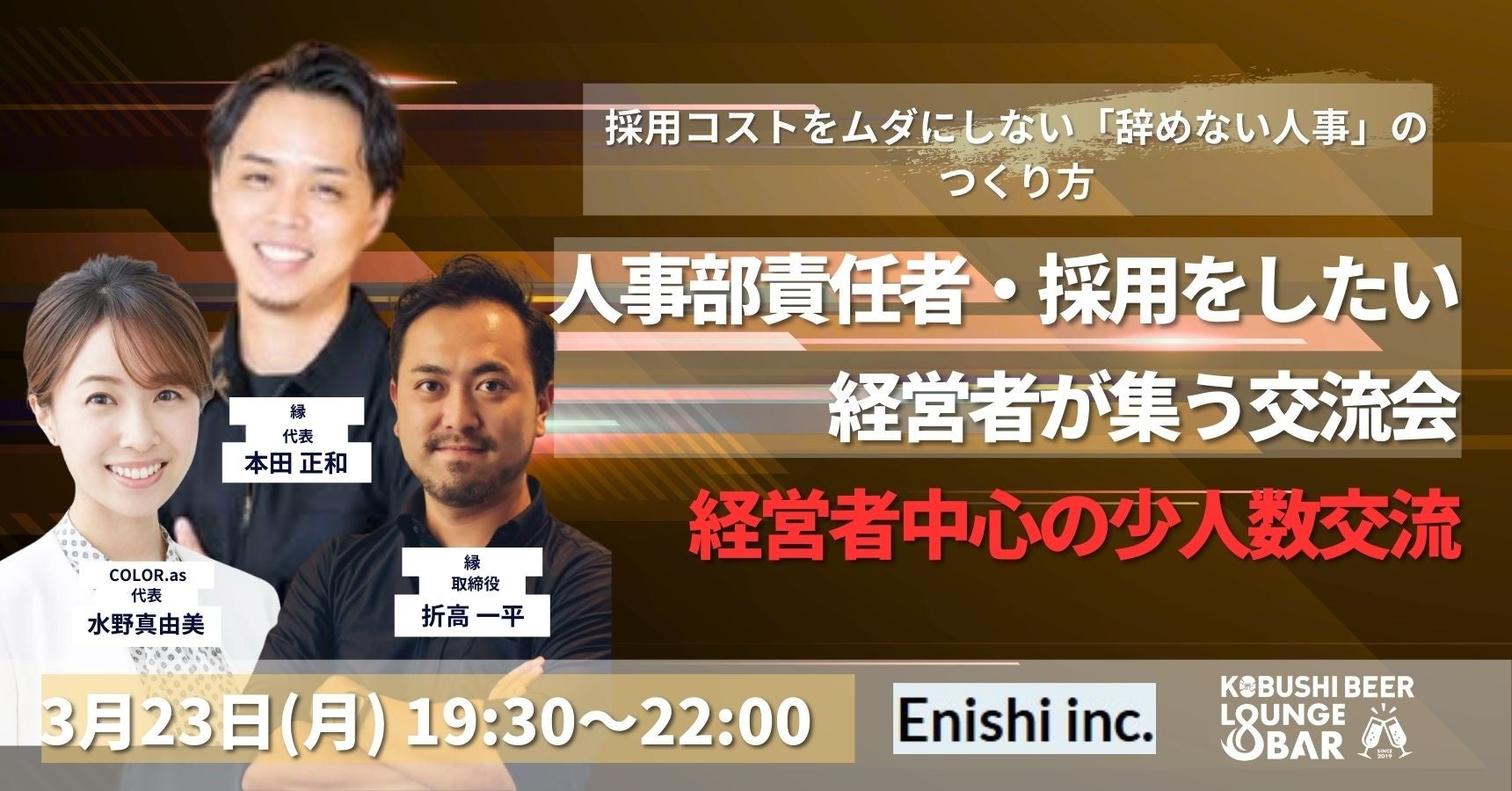 KOBUSHI MARKETING合同会社(東京都渋谷区、代表:井上裕介)が運営する渋谷道玄坂の『KOBUSHI BEER LOUNGE & BAR』では、人と人とを繋ぐユニークな取り組みを行い多くのビジネスチャンスを生み出している。そして今回、2026年3月23日(月)19:30~縁の本田代表・折高取締役、COLOR.asの水野代表のコラボで、採用コストをムダにしない「辞めない人事」のつくり方について学べる交流会を開催すると発表した。
