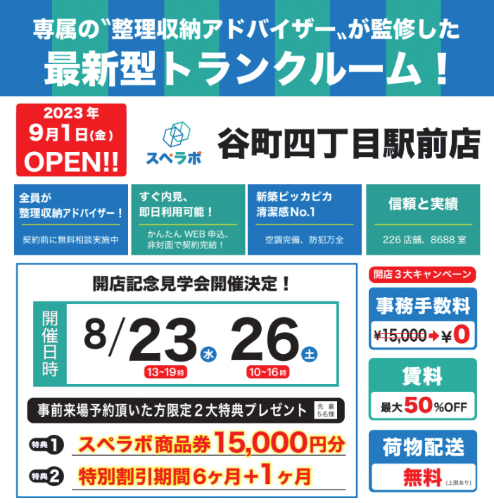 【谷町四丁目駅前店/9月1日(金)オープン】見学から契約、解約まで完全非接触・非対面!都内、大阪などにて絶賛運営中のトランクルーム【スペラボ】が谷町四丁目駅近くに出店!