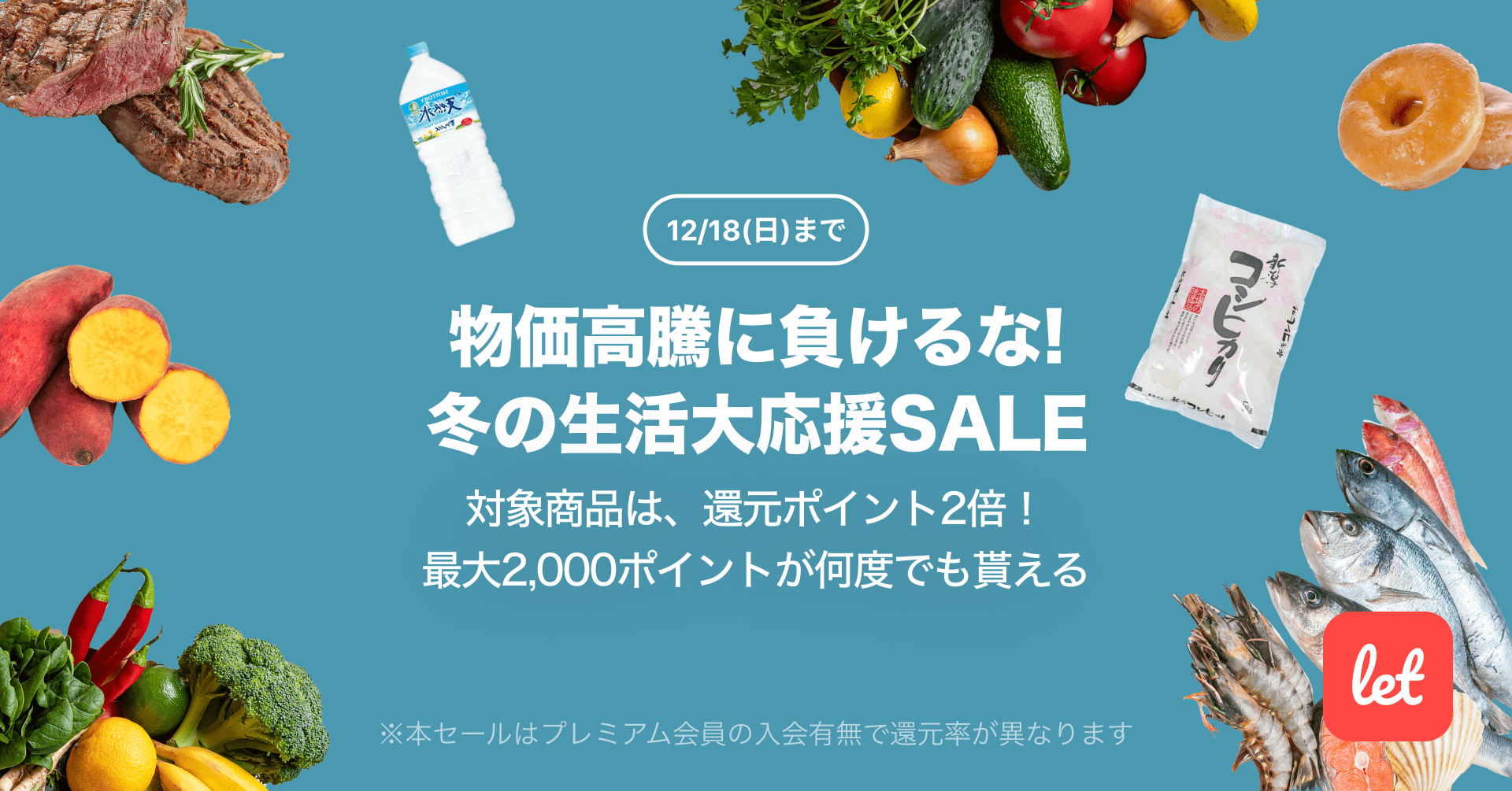 株式会社レット(本社:東京都港区、代表:佐藤 航陽)が運営する、食品ロス/在庫ロス削減のマーケット「Let(レット)」内で「物価高騰に負けるな!冬の生活大応援SALE」を12月 16日(金) 18:00より開催します。期間中、プレミアム会員様限定で対象の食品をご購入いただくと、2,000ポイントを上限に還元ポイントが2倍になります。期間中のご購入であれば、ポイント還元はお一人様あたり何度でもご利用いただけます。