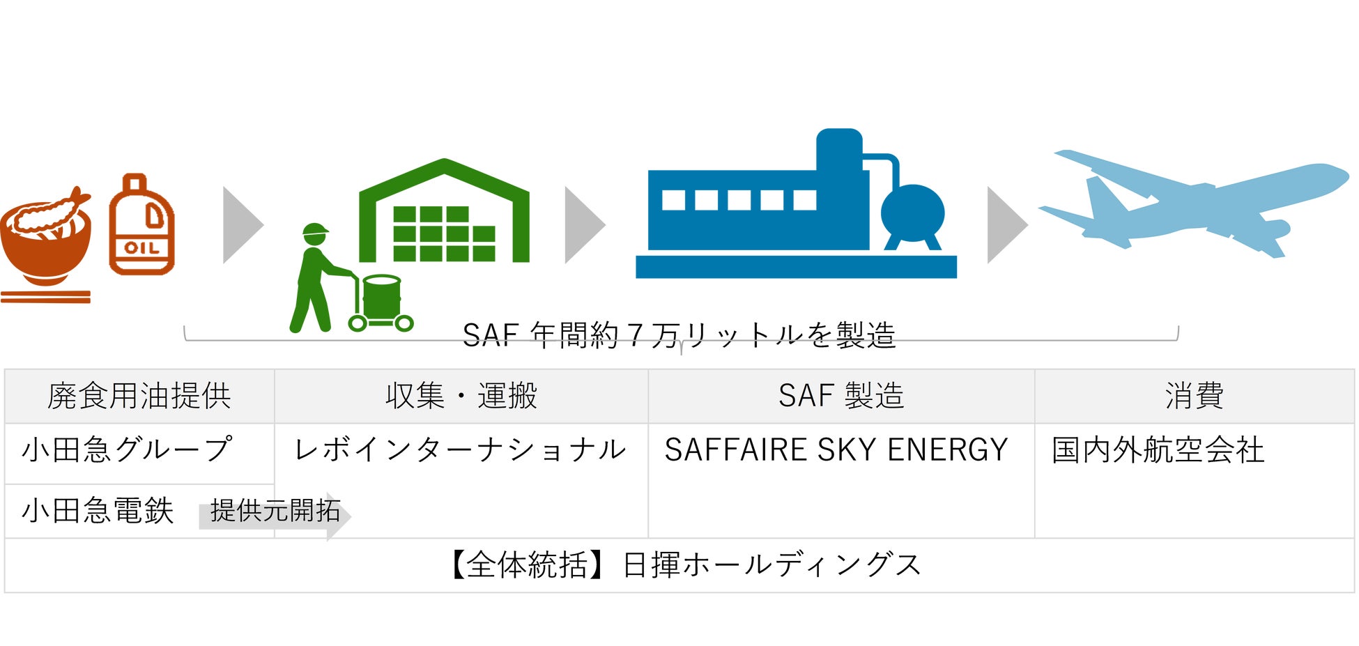 小田急電鉄株式会社(本社:東京都新宿区 取締役社長 鈴木 滋)、日揮ホールディングス(HD)株式会社(本社:横浜市西区 代表取締役会長CEO 佐藤 雅之)、株式会社レボインターナショナル(本社:京都市下京区 代表取締役CEO 越川 哲也)、合同会社SAFFAIRE SKY ENERGY(本社:横浜市西区 代表者 秋鹿 正敬)の4社は、2025年3月31日(月)、使用済み食用油(廃食用油)を国産の持続可能な航空燃料(SAF、「Sustainable Aviation Fuel」の略)の原料などとして再活用する取り組みのため、相互に協力する基本合意書を締結しました。翌4月1日(火)より、小田急グループ各施設の廃食用油年間約8.5万リットルの再活用を開始、沿線を中心に排出元を開拓するなど、その収集力も高めていきます。SAFは従来の航空燃料に比べて環境負荷が低く、日揮HDなどが国内初の大規模製造サプライチェーンを構築し、4月頃より航空各社へ供給を始める予定です。SAFの安定供給を支援することで、国内の資源循環を促進し、脱炭素社会の実現を目指します。