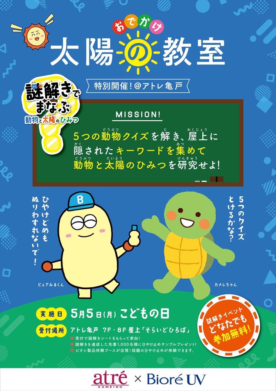 亀戸にすみだ事業所がある花王株式会社とコラボレーションをし、ビオレUV「おでかけ 太陽の教室」謎解きイベントを開催します。「おでかけ 太陽の教室」は、太陽のこと、地球のこと、お肌のことを親子でたのしく学ぶことができるイベントです。動物の紫外線対策や太陽とのかかわりについてのクイズを解いた後、ふれあい動物園の動物に会いに行って、屋上に隠されたキーワードを集めていきます。受付にて謎解きシートを受け取り、謎解きスタート。謎解きを達成した先着1,000名様に日やけ止めサンプル(ビオレUVキッズピュアミルク) をプレゼントします。
