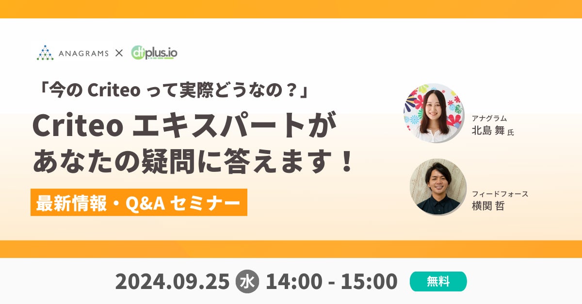 株式会社フィードフォース(所在地:東京都港区、代表取締役:塚田 耕司、以下「フィードフォース」)が提供する、マーケターのためのデータフィード管理ツール「dfplus.io」は、無料オンラインセミナー「Criteo エキスパートがあなたの疑問に答えます!最新情報 & Q&A セミナー」を 2024 年 9 月 25 日(水)に開催いたします。