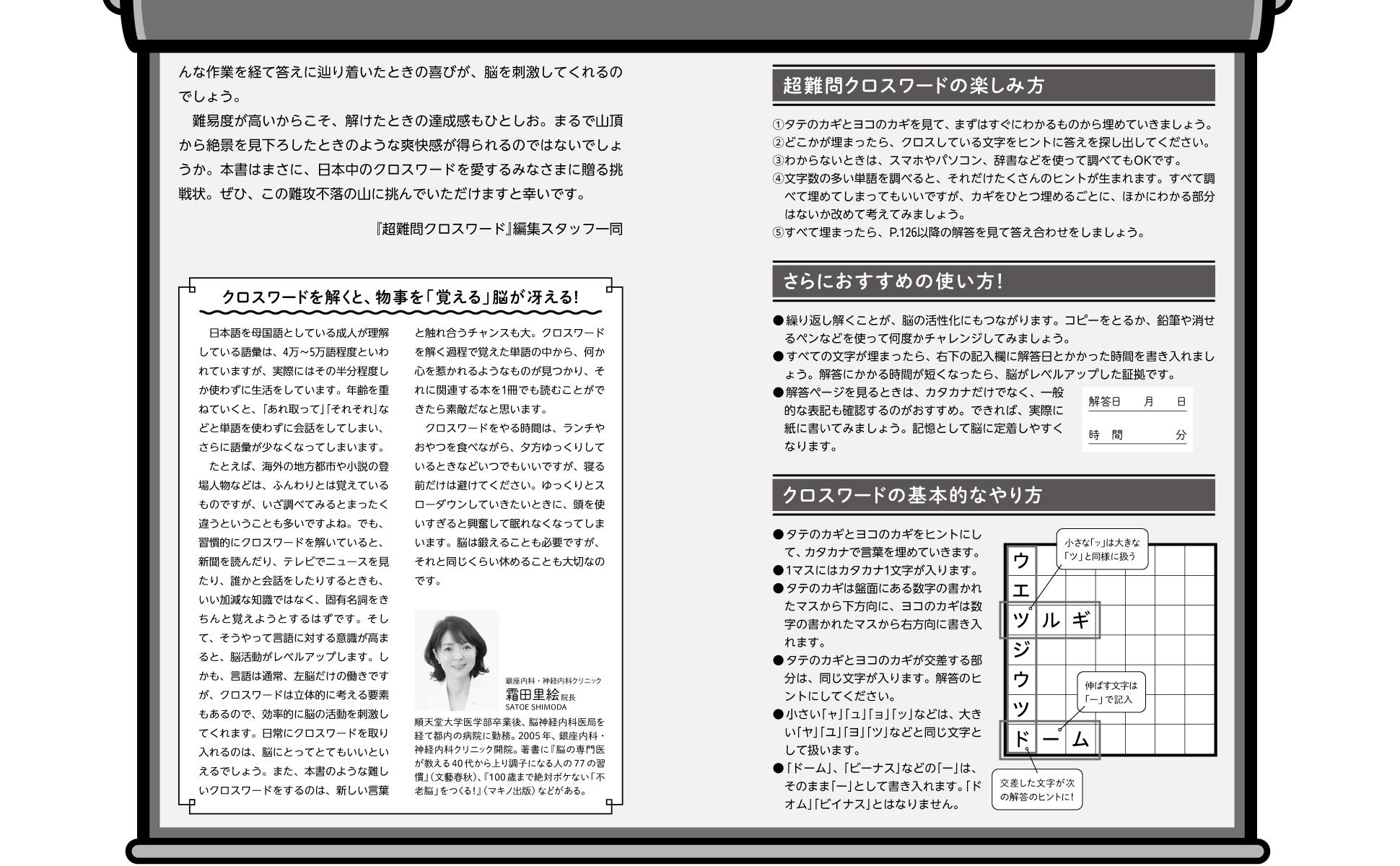 クロスワードの基本的なやり方、楽しみ方もご紹介。「クロスワードを解くことで老化による記憶力の低下が抑止されることが判明している」と語る、銀座内科・神経内科クリニックの霜田里絵院長のコラムも収録。