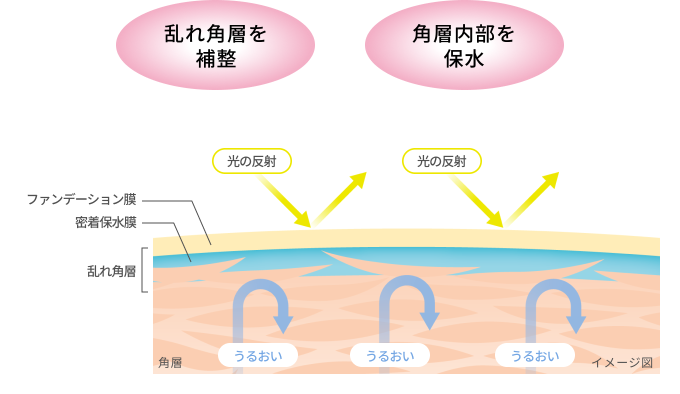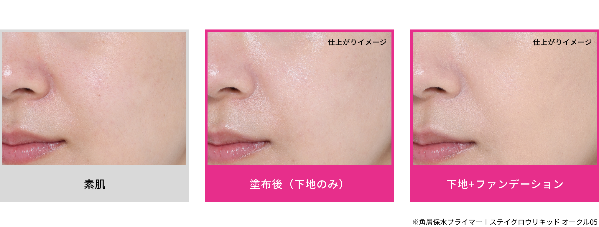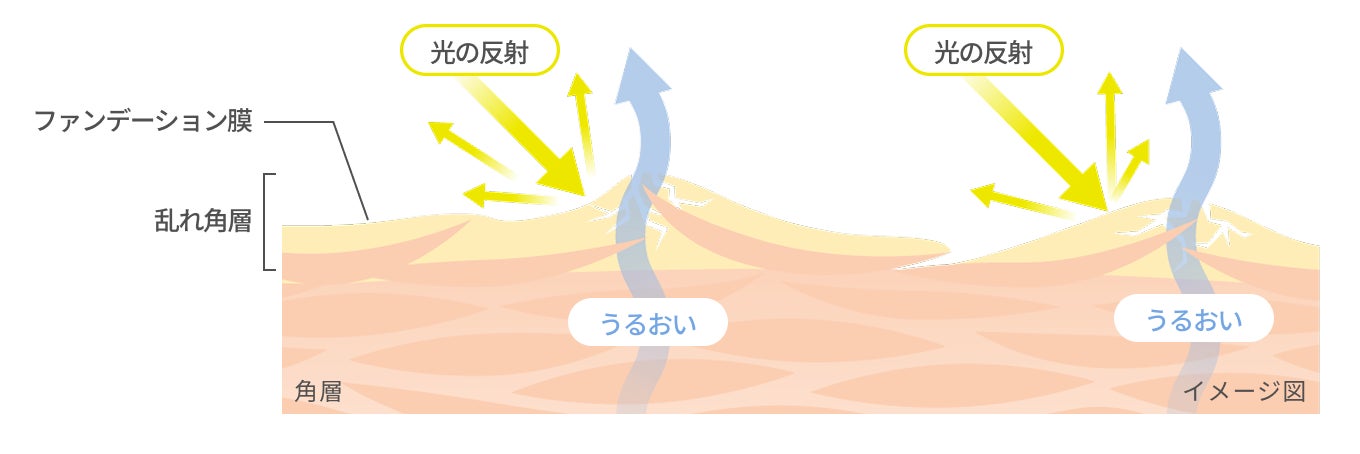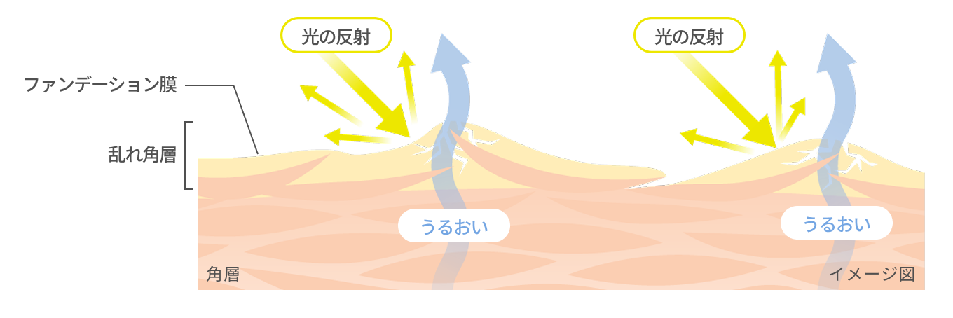 花王独自の密着保水膜が肌表面の「乱れ角層」に高密着し、きめの乱れやかさつき、毛穴による凹凸をなめらかに補整し、くずれから守ります。