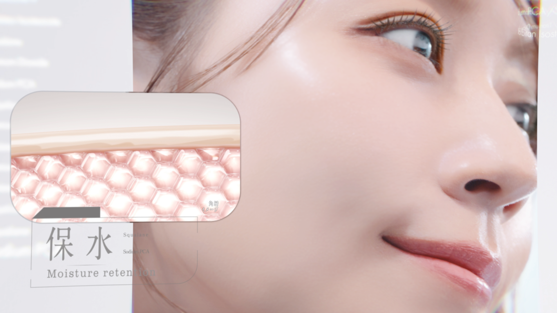 今回の新商品がもたらすイノベーションである、密着保水膜の補整と保水メカニズムを、精密なマクロショットと有村架純さんの隙のない美しい肌カットとともにお伝えします。生き生きとした表情で「生ツヤ肌、くずさない。」と力強く宣言する、有村架純さんにぜひご注目ください。