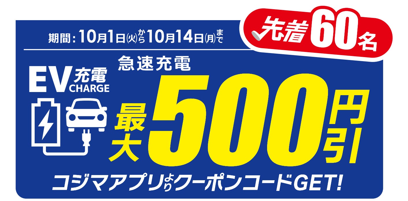 この度は、コジマ×ビックカメラ店舗へのテラチャージEV充電器の設置を記念し、コジマの協力のもと先着でコジマアプリからテラチャージの充電料金割引クーポンコードを入手できるキャンペーンを実施します。