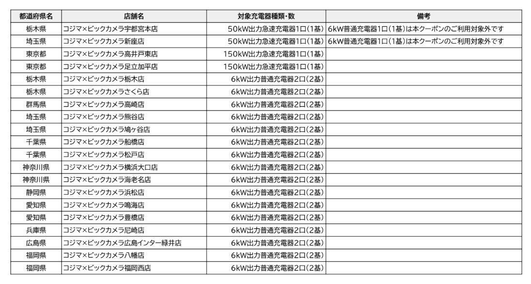 コジマ×ビックカメラ20店舗の急速充電器4口・普通充電器32口を対象に、クーポンコードで充電料金が割引に。