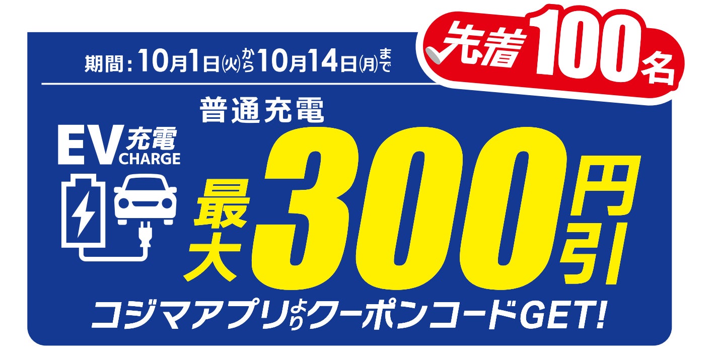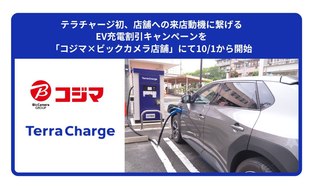 電気自動車(EV)向け充電サービス「Terra Charge(テラチャージ)」を展開するTerra Charge 株式会社(本社:東京都港区、代表取締役社長:徳重徹、以下「当社」)は、2024年10月1日から2024年10月14日までの期間、ビックカメラグループの株式会社コジマ(本社:栃木県宇都宮市、代表取締役社長 中澤裕二、以下「コジマ」)の協力のもと、コジマが運営するコジマ公式アプリからクーポンコードを入手することで、コジマ×ビックカメラ20店舗に設置されたテラチャージEV充電器の利用料金が割引になるキャンペーンを開始します。