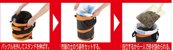 「土のう袋用スプリングスタンド」は、スタンドが自立するので、一人作業でも土入れがしやすく作業の時間短縮に繋がります。さらに、本製品は、あえて底をなくした筒状になっているため、袋の交換時にはスタンドを引き抜くだけで、重い袋を持ち上げる必要がありません。