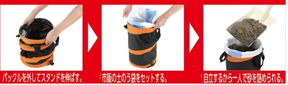 自立したスタンドで詰め込みやすく、底が無いから袋の交換もらくらく!使い方様々で作業時のごみ回収にもぴったりな「K+BUILD 土のう袋用スプリングスタンド」が新登場!