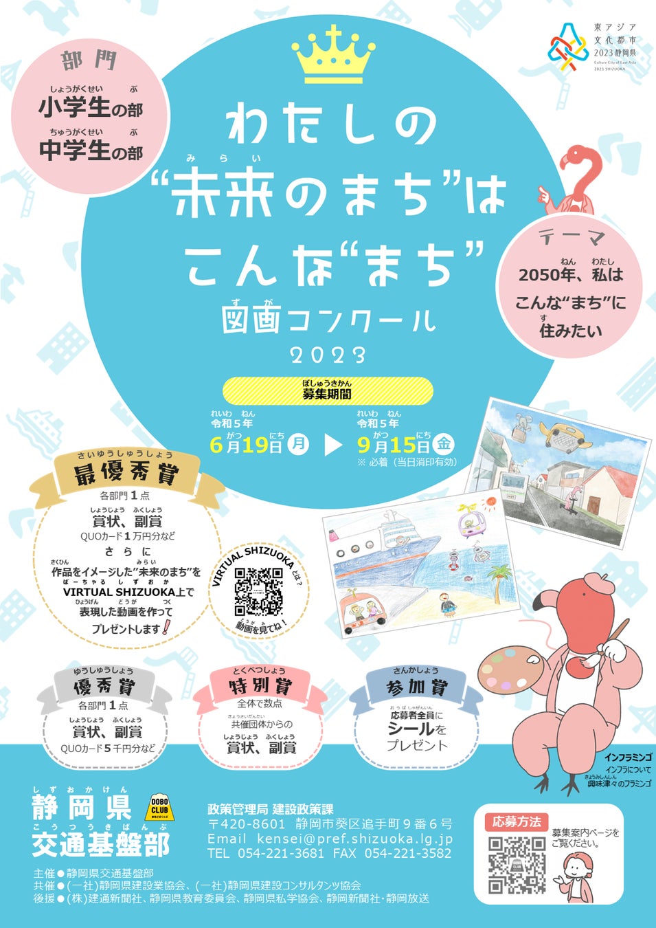 あなたが想像する静岡のみらいのまちを、生活を支える道路や港などのインフラとの関わりを見せながら書いてください。本年のテーマは「交通ネットワークを上手に使いながら、他のまちとの交流をさかんにできる、魅力ある、元気な静岡県」とします。