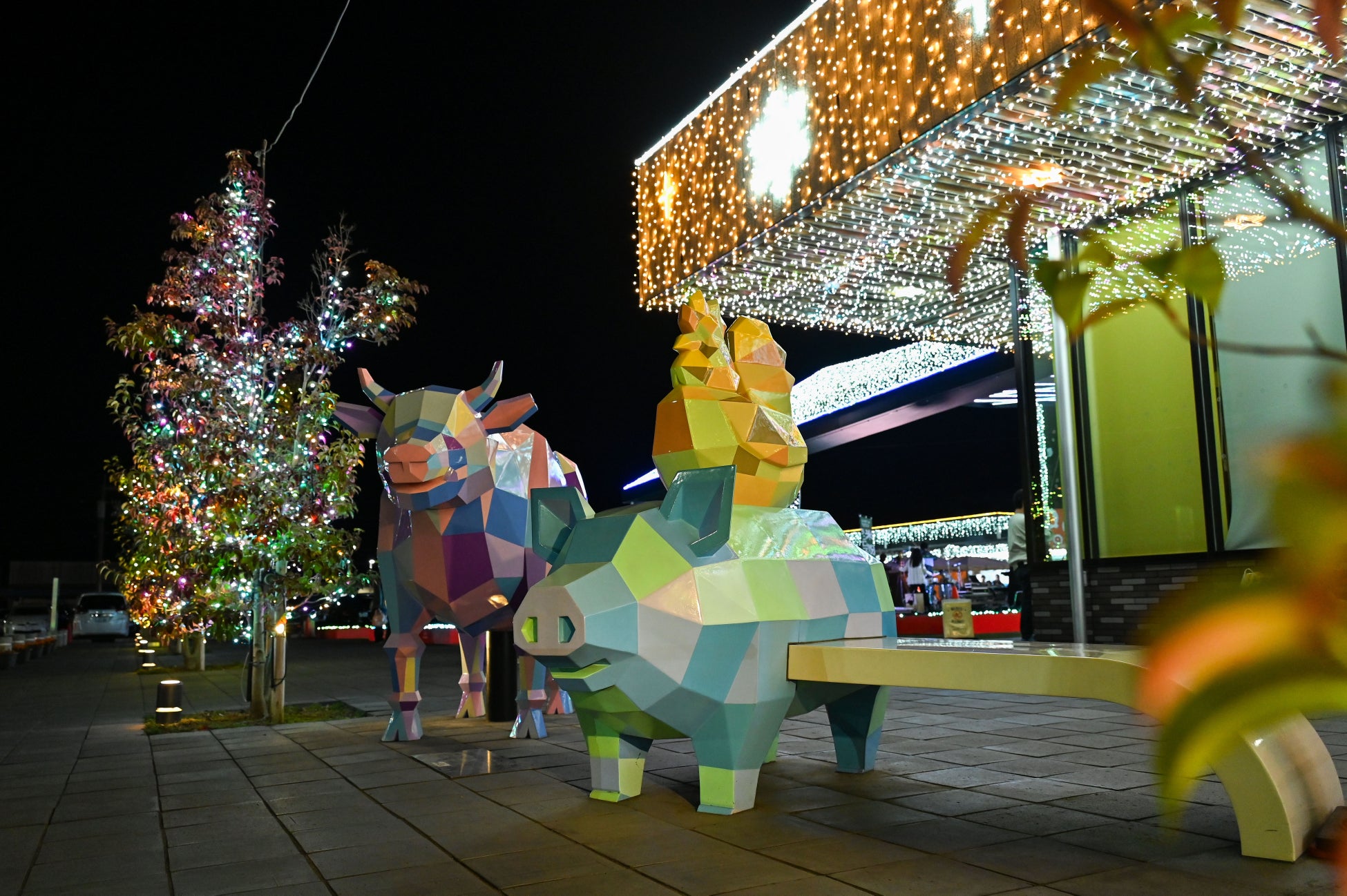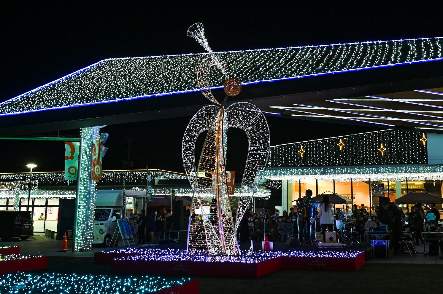 芝生広場には、シンボルとなる大型のオブジェを設置したほか、イルミネーションを一面に張り巡らし幻想的な空間を演出しています。また、特徴的なデザインのイベント広場天井や屋根は、その魅力を引き立てるよう線と面で色とりどりに装飾されていて、国道側の”NiQLL”ロードサインはNiQLLカラーで彩りました。