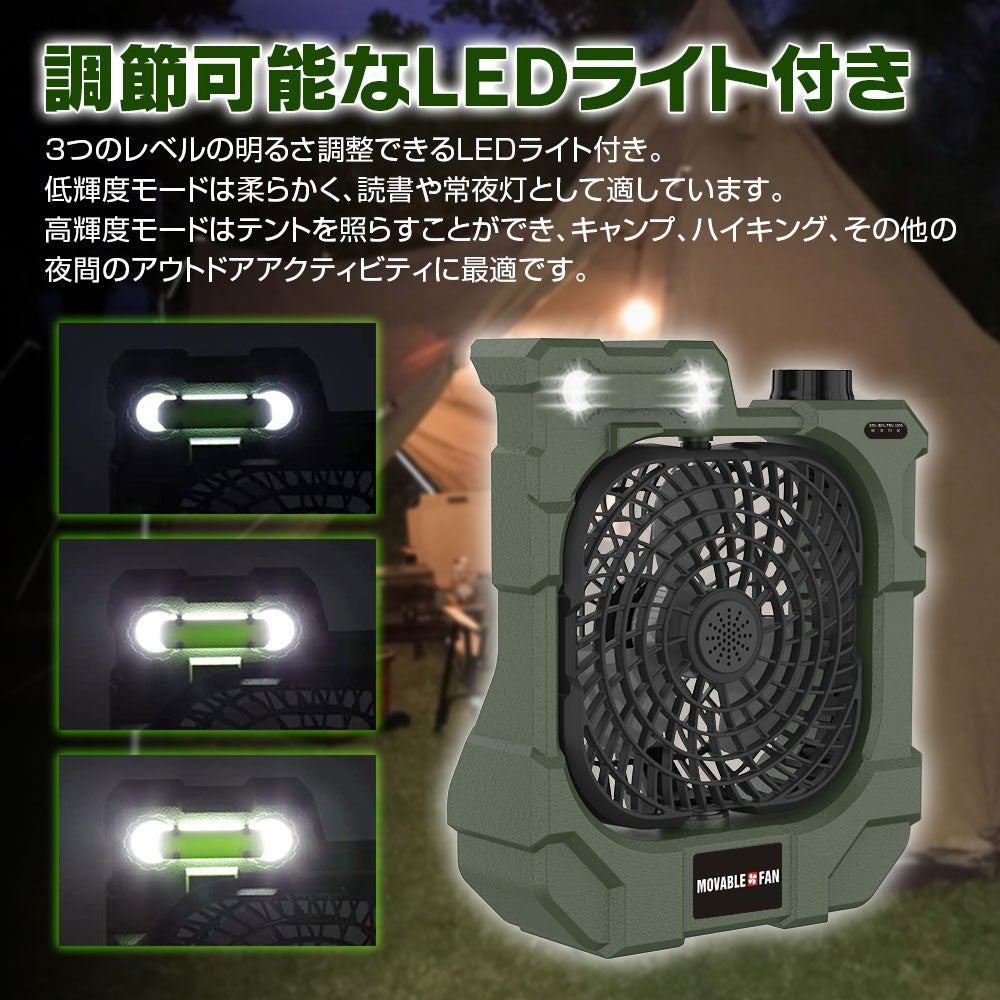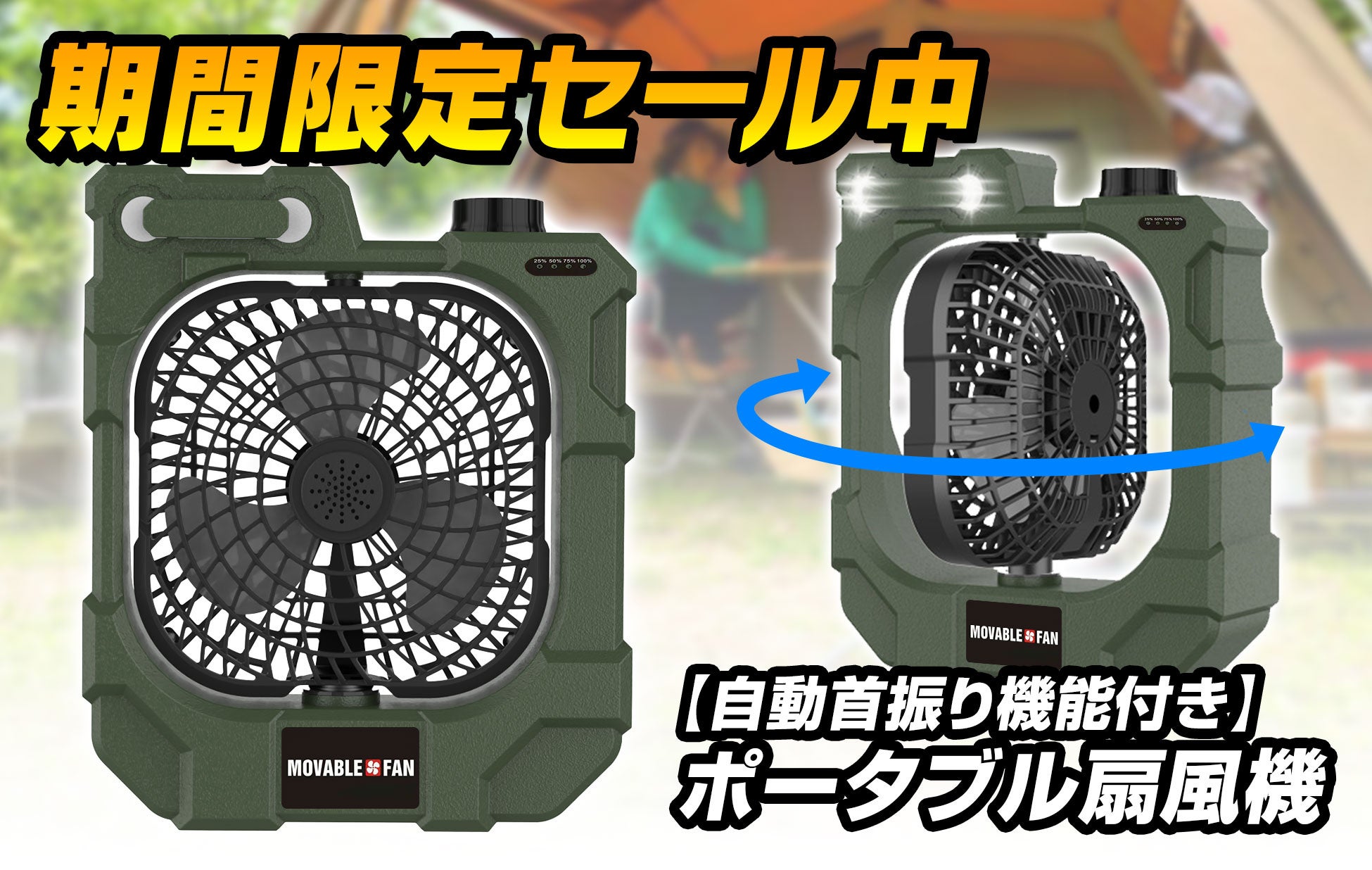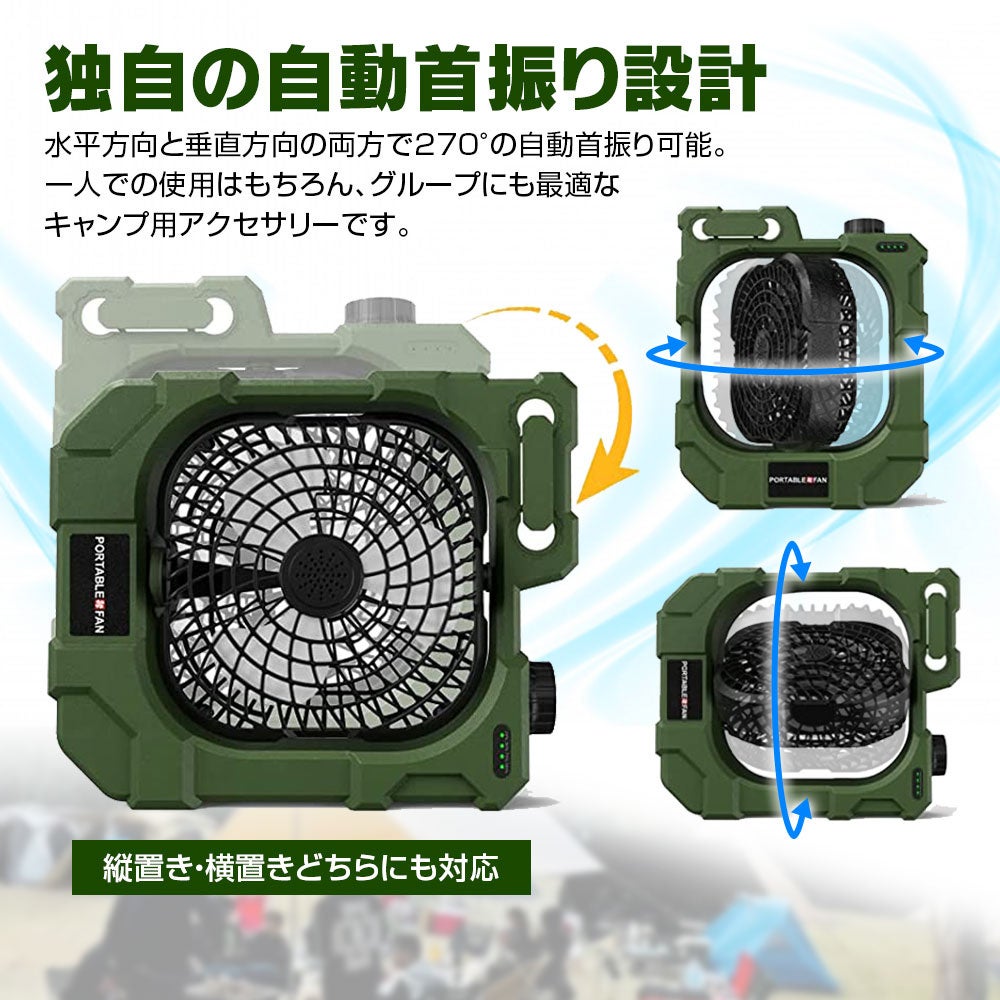 大容量バッテリー搭載で270°の角度調節が可能な自動首振り機能搭載!アウトドアやキャンプなどに最適!