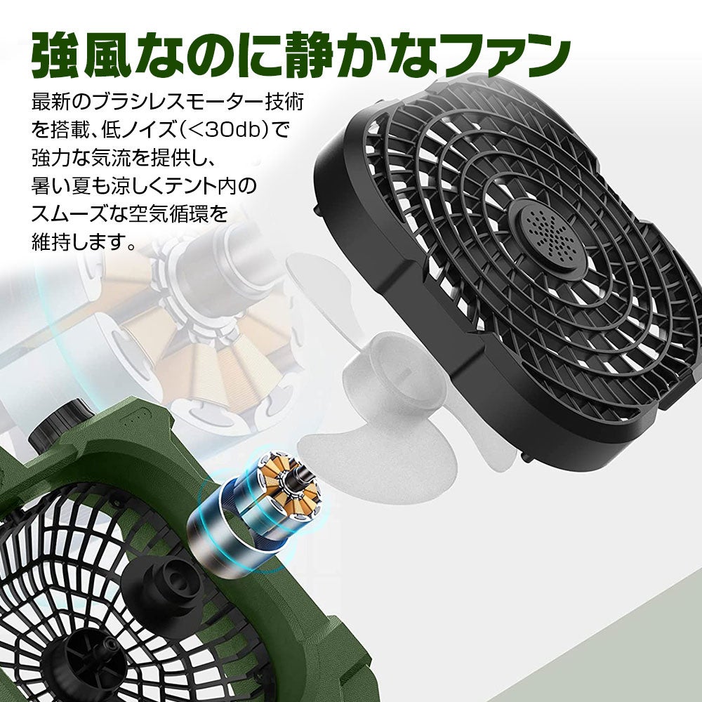 最新のブラシレスモーター技術を搭載、低ノイズ(<30db)で強力な気流を提供し、暑い夏も涼しくテント内のスムーズな空気循環を維持します。
