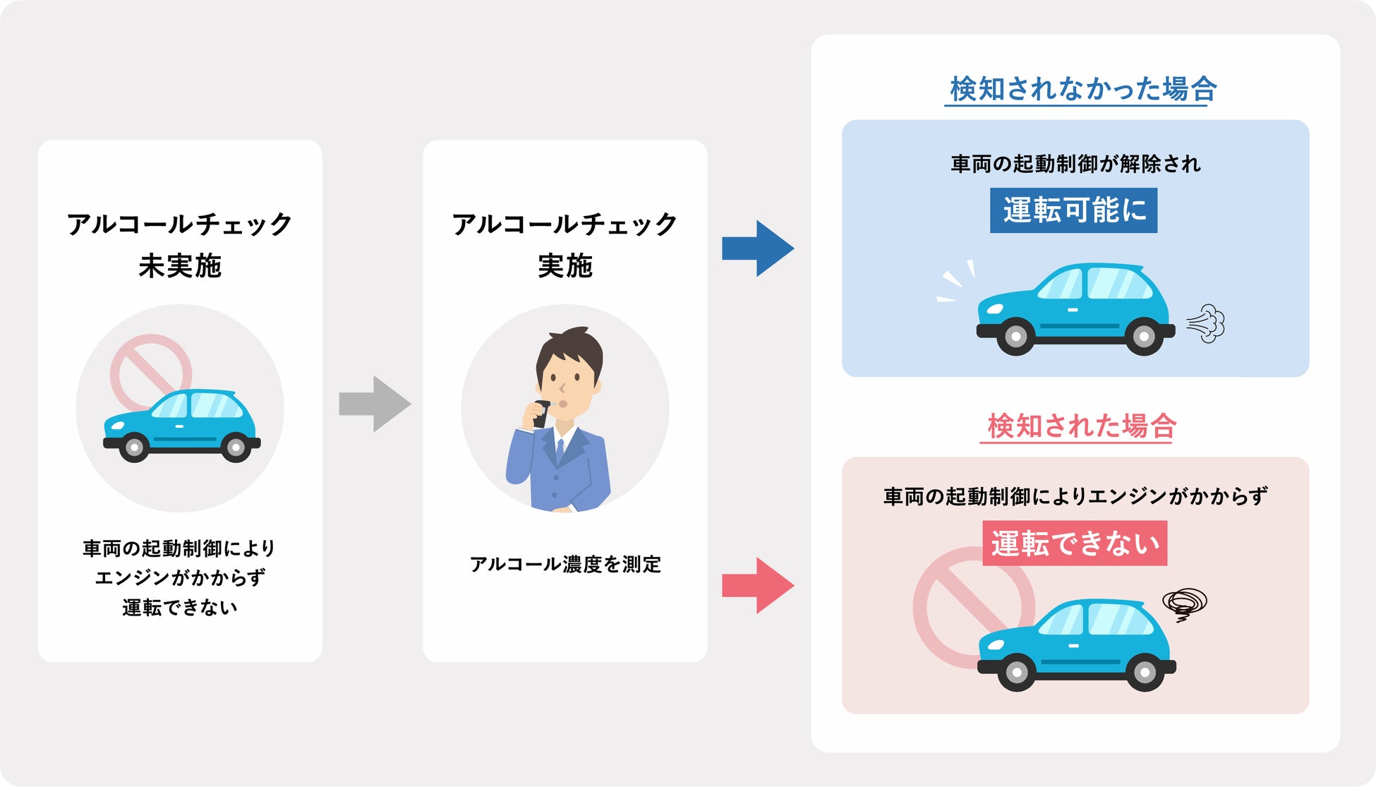 アルコール・インターロックは、アルコールチェックが未実施の場合、または検査結果が基準値を超えた場合に車両の起動を制御し、エンジンがかからないようにするシステムです。