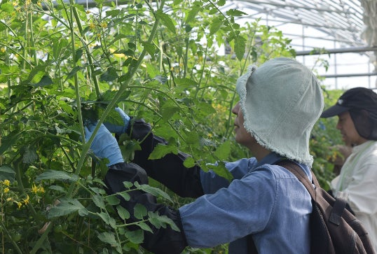 参加者には、ミニトマトの基礎知識や就農に関する支援制度の案内などの座学のあと、ビニールハウスで摘葉や収穫など、栽培に必要な作業を体験していただきました。参加者からは「限られた時間のなかで、栽培に関する基本的な知識を学ぶことができた」「他の作物や季節にも開催してほしい」と大変好評でした。