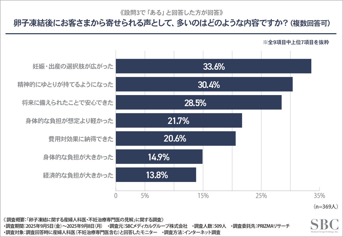 ・「妊娠・出産の選択肢が広がった(33.6%)」「精神的にゆとりが持てるようになった(30.4%)」「将来に備えられたことで安心できた(28.5%)」など、前向きな反応が多く寄せられた