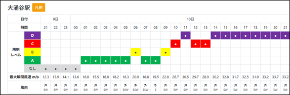 「AI強風予測」は、最大瞬間風速と「規制レベル」を予測します。
