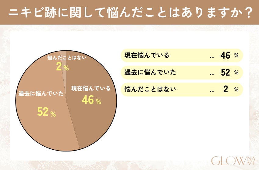 アンケートの結果、「現在悩んでいる」「過去に悩んでいた」を併せて98%の人がニキビ跡に悩んだことがあるということが分かりました。