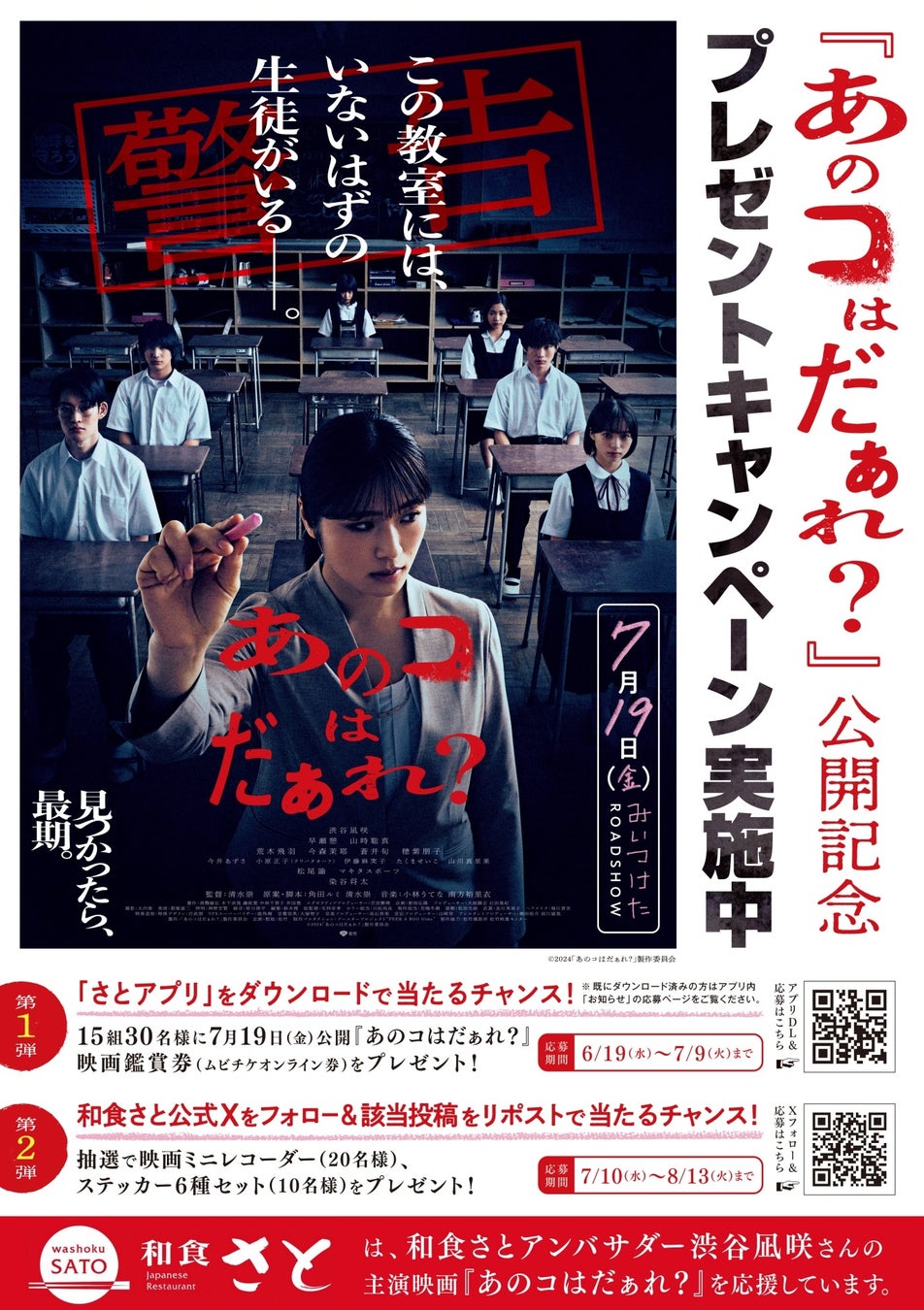 第1弾<2024年6月19日(水)~7月9日(火)>は、和食さと公式アプリをダウンロードしているお客さまへの限定企画として、応募ページから必要情報を入力して応募すると7月19日(金)に公開される映画「あのコはだぁれ?」の劇場鑑賞券(15組30名様)が当たるキャンペーンを開催します。