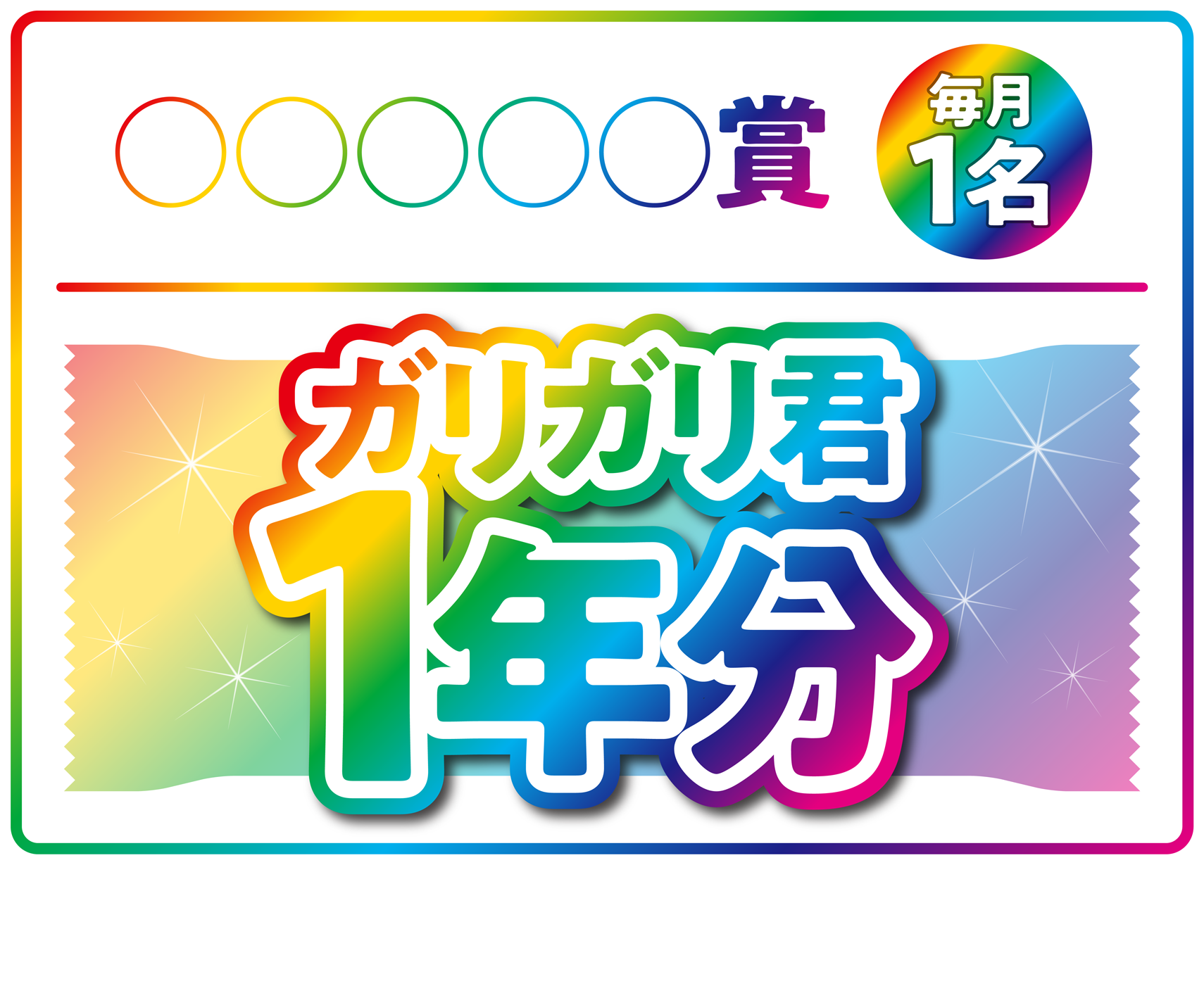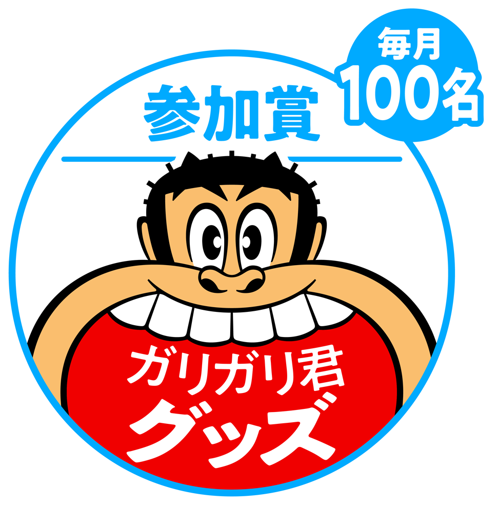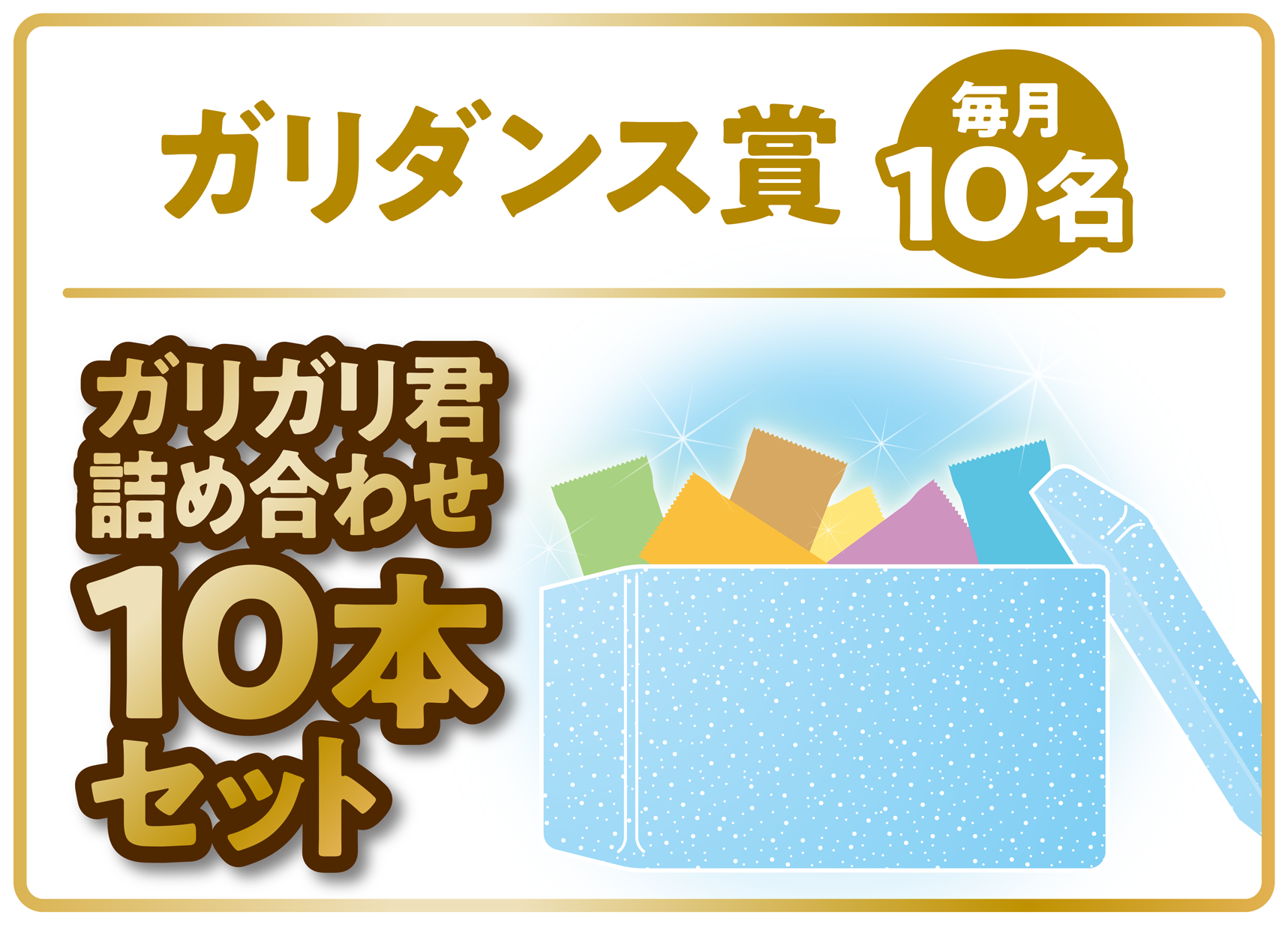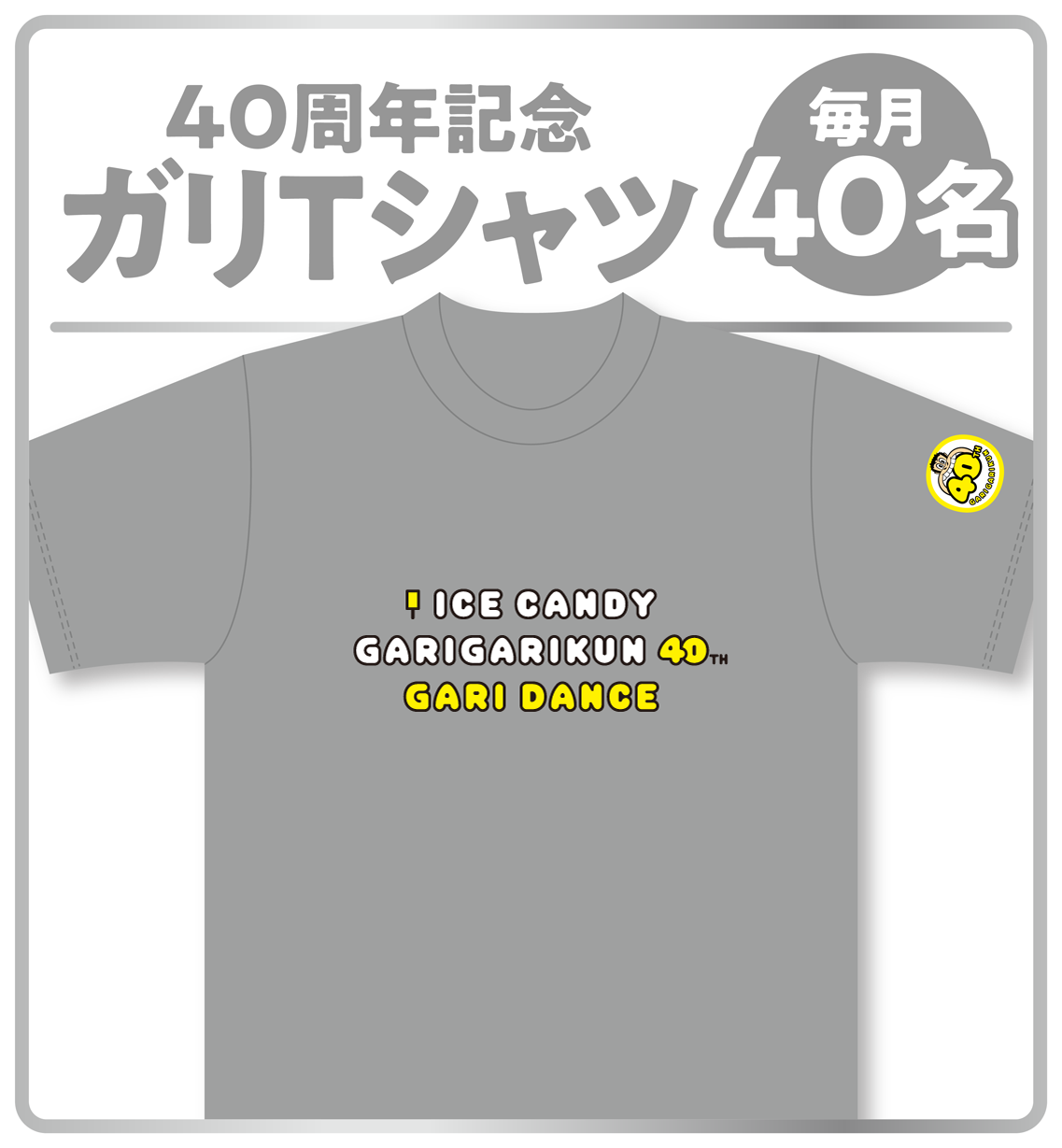 | 景品 | ~ガリダンススタッフがみんなで選ぶ~ ●「〇〇〇〇〇賞」ガリガリ君1年分(各月1名) ※毎月30,31本送付×12ヵ月 ●「ガリガリ君賞」ガリガリ君詰め合わせ10本セット(各月10名) ~抽選で当たる~ ●40th 記念ガリTシャツ(各月40名) ●40th 記念ハンカチ (各月40名) ●参加賞 (各月100名) |