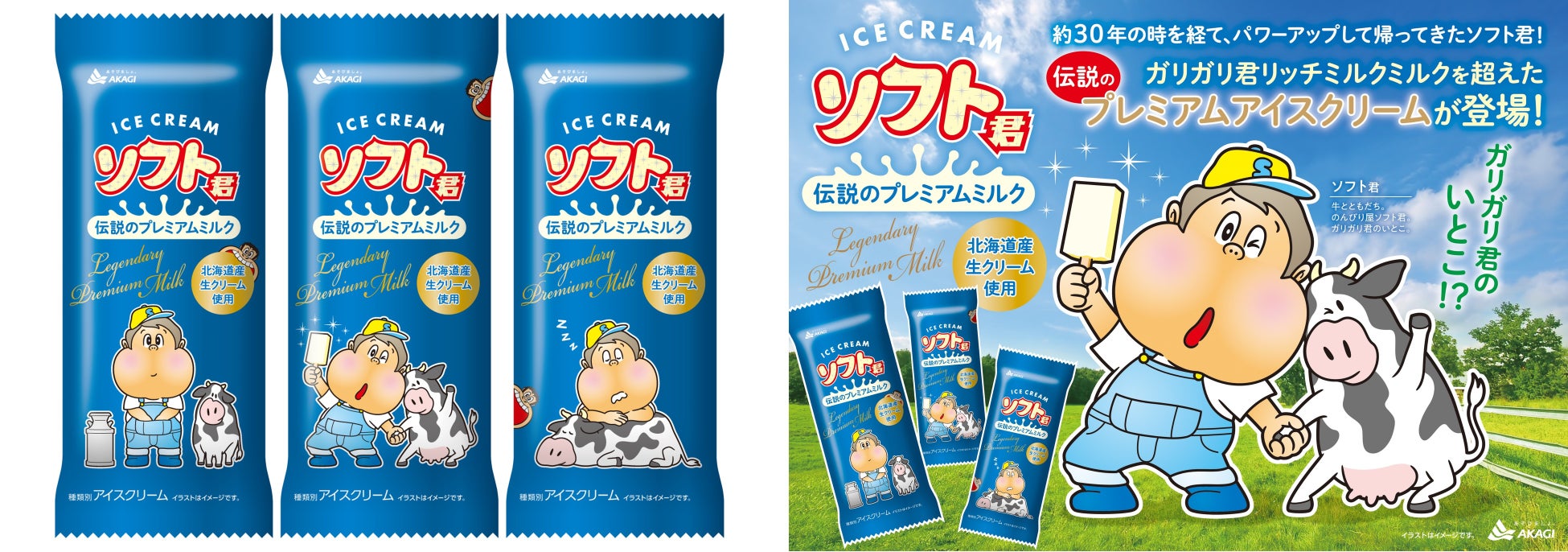 パッケージにはデザインを新たに、約30年ぶりにソフト君(ガリガリ君のいとこ)が帰ってきました。