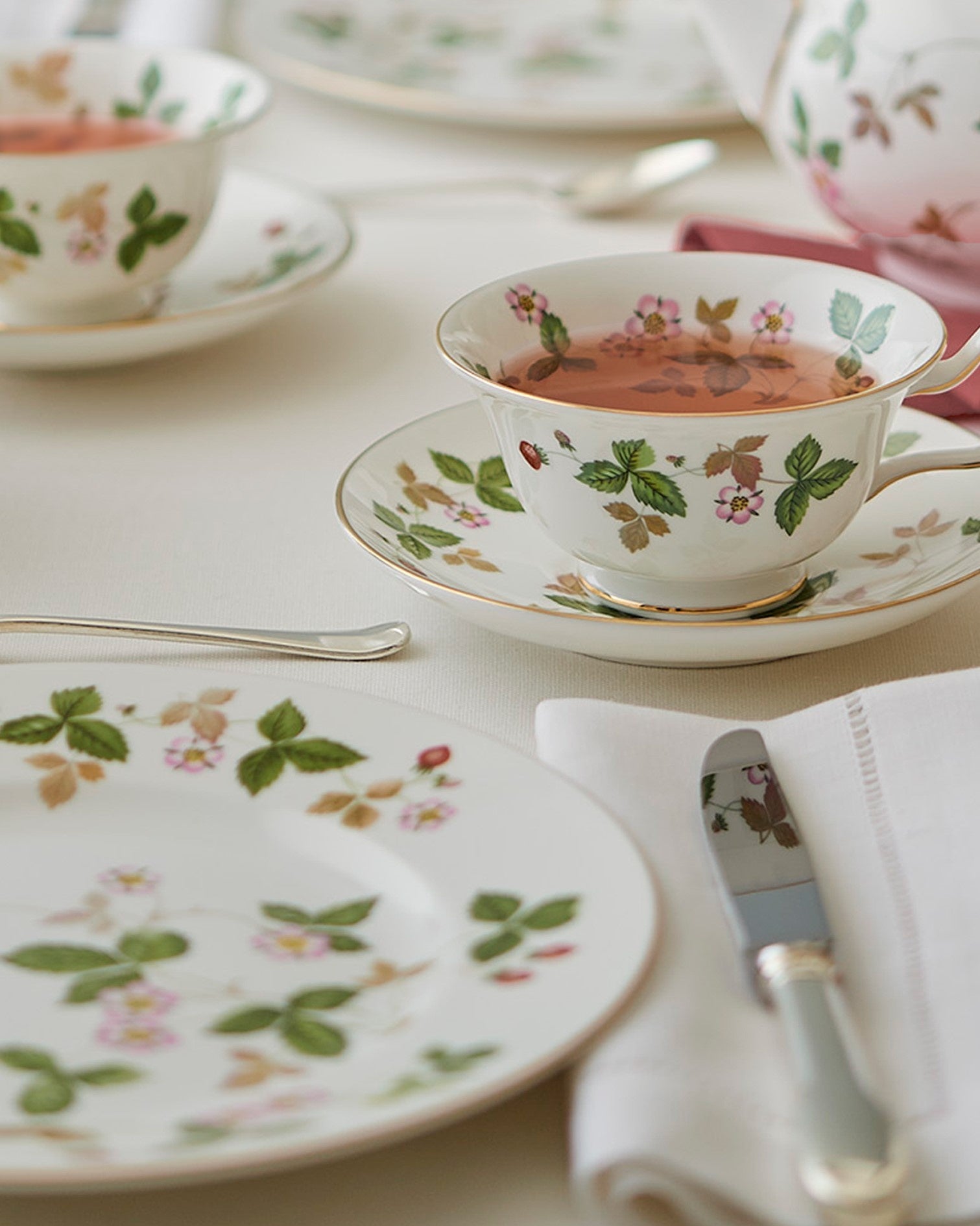 ウェッジウッドを代表するコレクションのひとつで、英国の自然を想わせる野いちごが可憐に描かれた「ワイルド ストロベリー」。ワイルドストロベリーの花言葉は「尊重と愛情」「幸福な家庭」「無邪気」とされ、上手に育てることができると幸せになれるとも言われています。ウェッジウッドでは、創業初期のパターンブックにその原型を見ることができます。