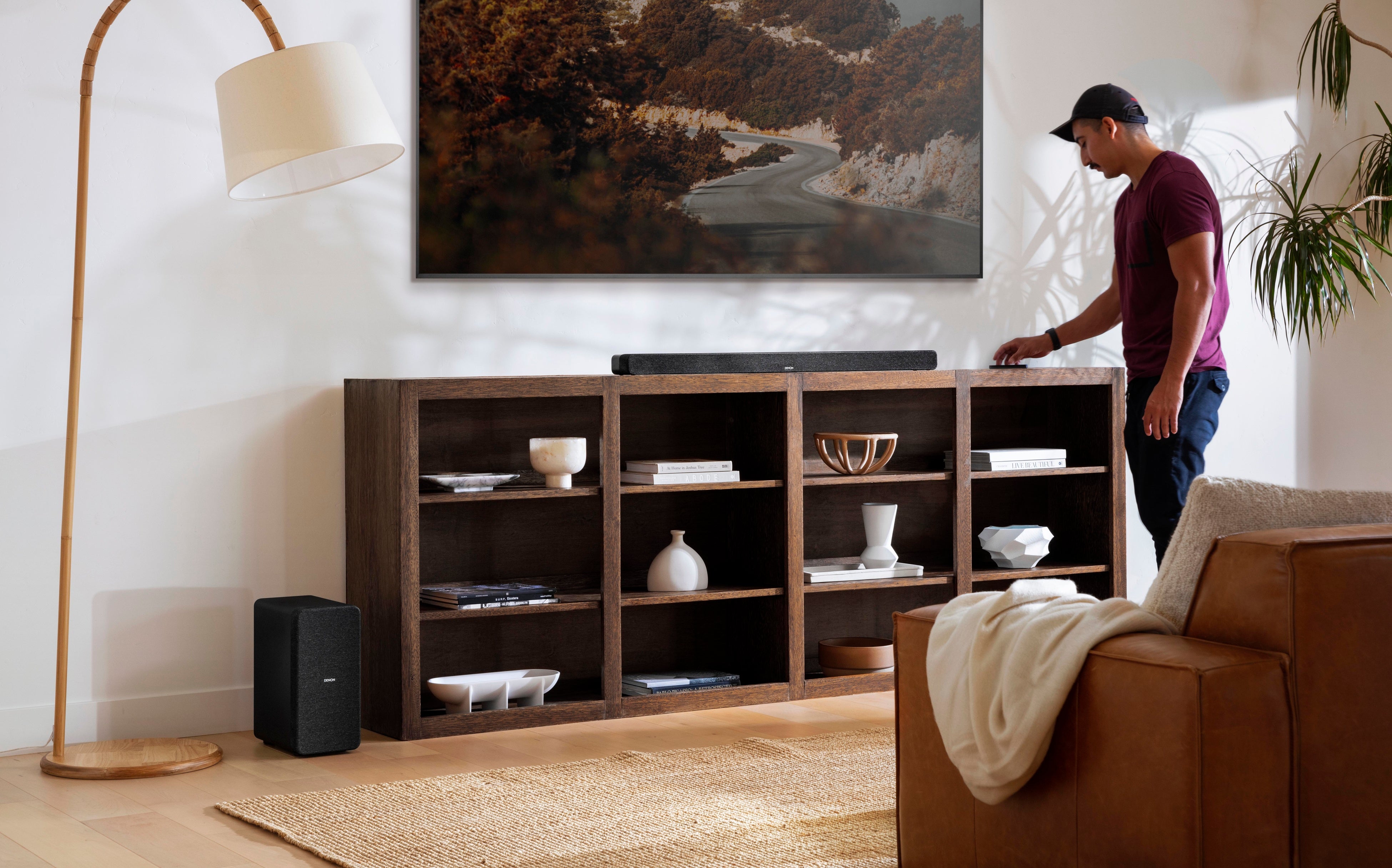 ワイヤレスワブウーハーには映画も音楽も迫力たっぷりに再生する150mmの大口径ドライバーを搭載しています。サブウーハーの音量はリモコンで簡単に調整できるので、コンテンツや視聴環境に合わせて柔軟な設定変更が可能です。幅172mm、奥行290mmとA4用紙よりも小さなスペースに設置でき、サウンドバーとの接続もワイヤレスなので置き場所に困ることはありません。サウンドバーは幅1,050mmで49型~55型のテレビに最適な大きさです。画面やリモコン受光部をさえぎらないように高さを60mmに抑えたスリムデザインとしています。また、壁に掛けて設置することもできます。