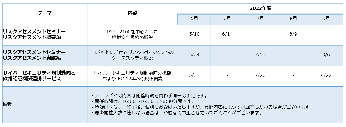 今回実施する「リスクアセスメントセミナー」では、ISO 12100の基礎知識から実践的な導入方法を、「サイバーセキュリティ規制動向と欧州認証機関連携サービスセミナー」では、IEC 62443の概要やサイバーセキュリティ規制動向について解説いたします。